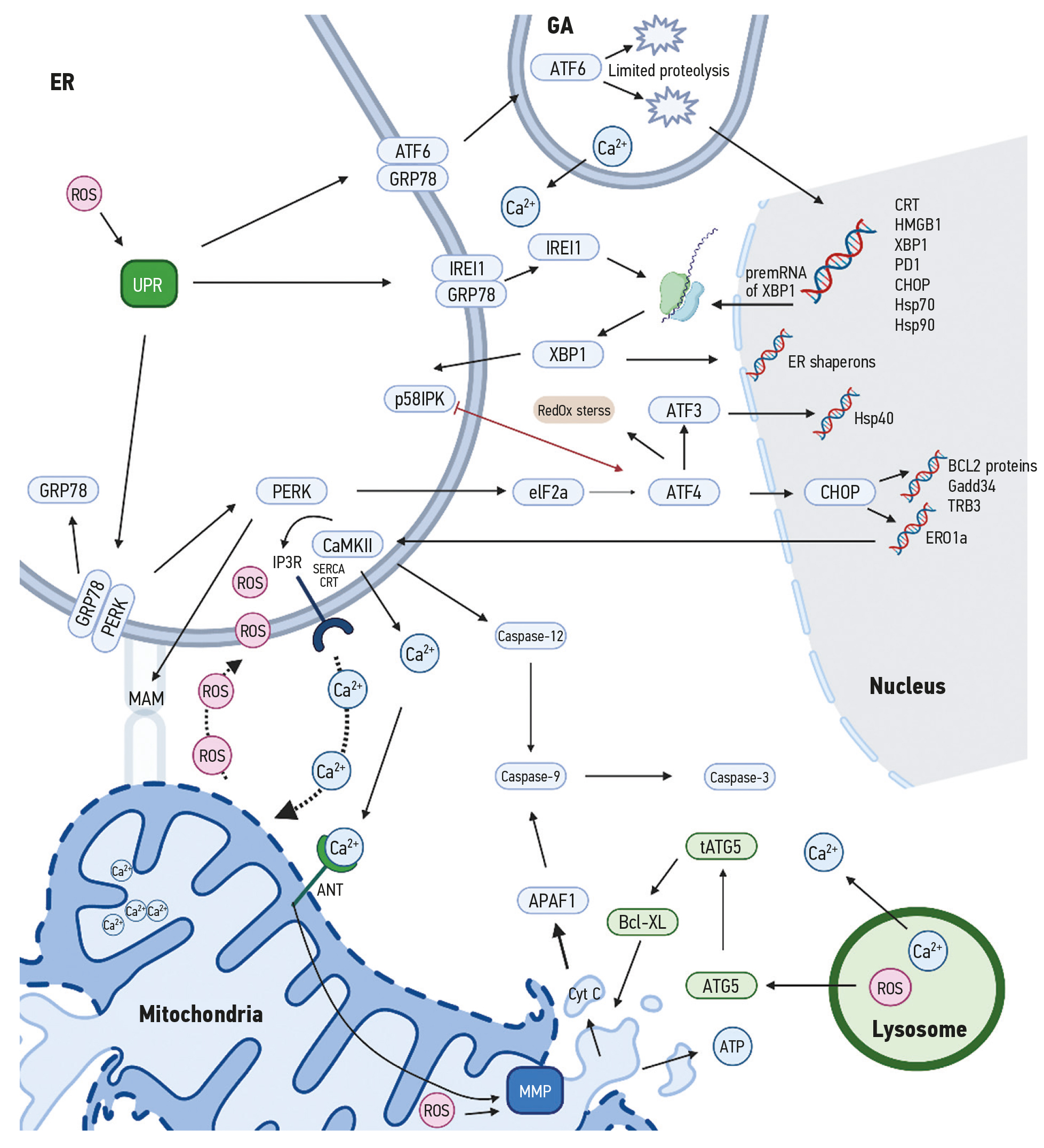 An important feature of ER and GA is the presence of Ca-related proteins. Specific and limited PDI oxidation by endoplasmic reticulum disulphide oxidase 1α (ERO1α) is essential for avoiding ER hyperoxidation. Under normal physiological conditions, the ER forms an oxidizing environment, and Ca2+ stores are filled, allowing the proper function of the various chaperones. During ER stress, ERO1α is upregulated in a CHOP-dependent manner, leading to ER hyperoxidation. Because the conformation of the third luminal loop of inositol trisphosphate receptor (IP3R) depends on the oxidation state, hyperoxidation could disrupt the interaction between ERp44 and IP3R, causing IP3R hypersensitivity, increased calcium release, and induction of apoptosis [162].