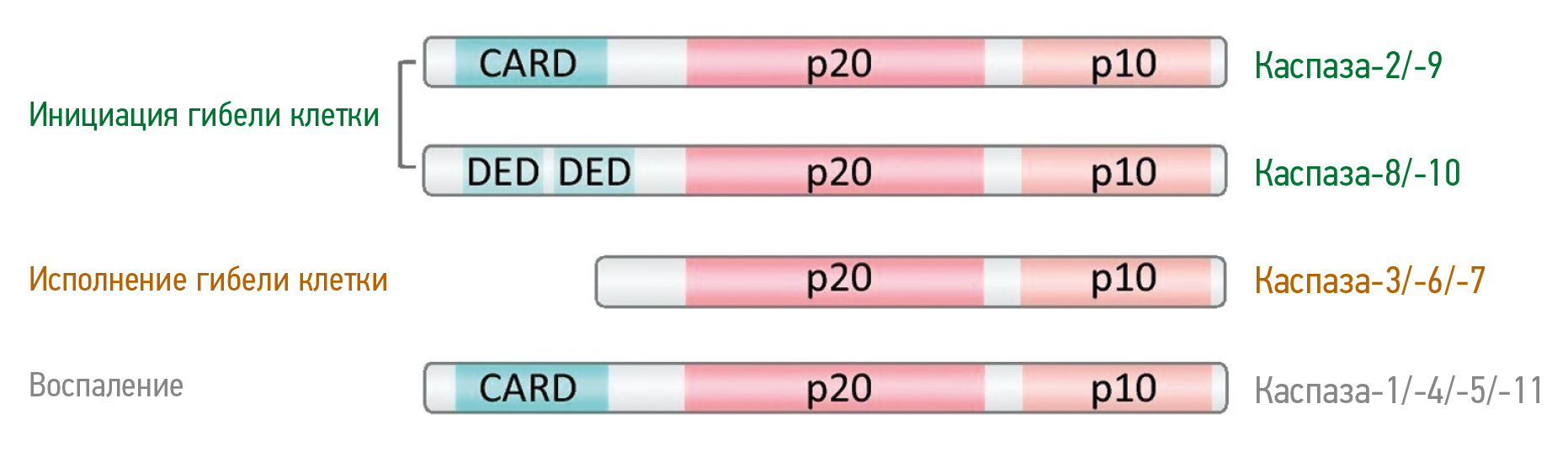 Рис. 1. Схема строения каспаз [1]. DED (death effector domain) — домен эффектора смерти, CARD (caspase activation and recruitment domain) — домен активации и рекрутирования каспазы.