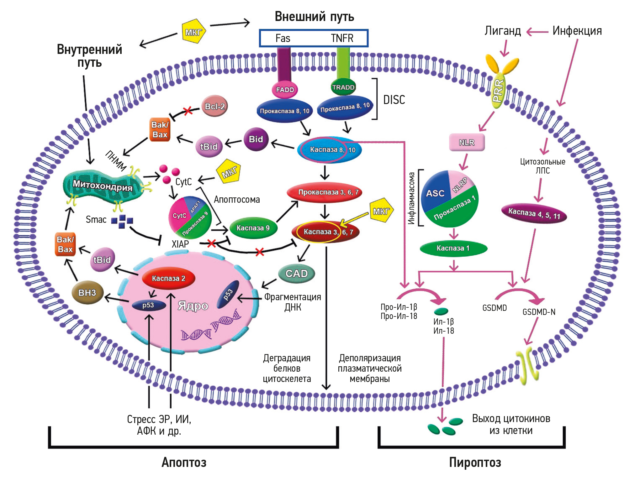 Fig. 2. Activation of caspases during apoptosis and pyroptosis (modified author’s scheme according to [16]). The arrows indicate the activation of cascade reactions. The crossed out arrow indicates inhibition. A description of the reaction cascade is given in the text. Here: АФК — reactive oxygen species (ROS); ИИ — ionizing radiation; Ил — interleukin; ЛПС — lipopolysaccharides; МКГ — microgravity; ПНММ — mitochondrial outer membrane permeabilization; ЭР — endoplasmic reticulum; TNFR — tumor necrosis factor receptor; Fas — is a death receptor on the surface of cells (CD95 or АPО-1); FADD — FAS-associated death domain protein; TRADD — tumor necrosis factor receptor type 1-associated DEATH domain protein; DISC — death-inducing signaling complex; Bid, tBid, Bak, Bax, BH3 — proapoptotic proteins of the Bcl-2 family; Bcl-2 — anti-apoptotic proteins regulating Bak, Bax; CAD — caspase-activated DNase; XIAP — X-linked inhibitor of apoptosis protein; CytC — cytochrome С; Smac — second mitochondria-derived activator of caspase; APAF1 — apoptotic protease activating factor 1; PRRs — pattern recognition receptors; NLR, NLRP — Nod-like receptor; ASC — apoptosis-associated speck-like protein containing a CARD; GSDMD — gasdermin D; GSDMD-N — activated gasdermin D N-domain.