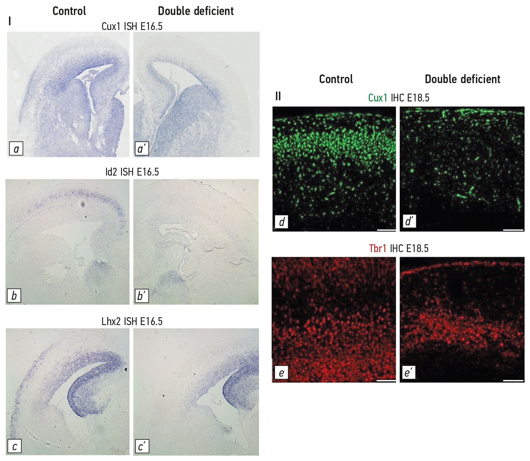 Рис. 2. NeuroD2/6 контролирует экспрессию других факторов транскрипции в развивающейся коре головного мозга: I — паттерны экспрессии генов в нейронах верхних слоёв были нарушены в коре головного мозга мышей с двойным нокаутом NeuroD2/6: гибридизация in situ для Cux1 (a, a’), Id2 (b, b’), Lhx2 (c, c’); II — экпрессия Cux1 и Tbr1 нарушена в нейронах верхних слоёв у мышей с двойным нокаутом NeuroD2/6, и количество клеток в глубоких слоях, экспрессирующих Tbr1, уменьшено: иммунофлуоресцентное окрашивание на Cux1 (зелёный канал, d, d’), Tbr1 (красный канал, e, e’). Гибридизацию in situ проводили на 16-й день эмбрионального развития, а иммунофлуоресцентное окрашивание — на 18-й день эмбрионального развития. Увеличение, при котором получены изображения гибридизации in situ, — ×5. Бар — 100 мкм.