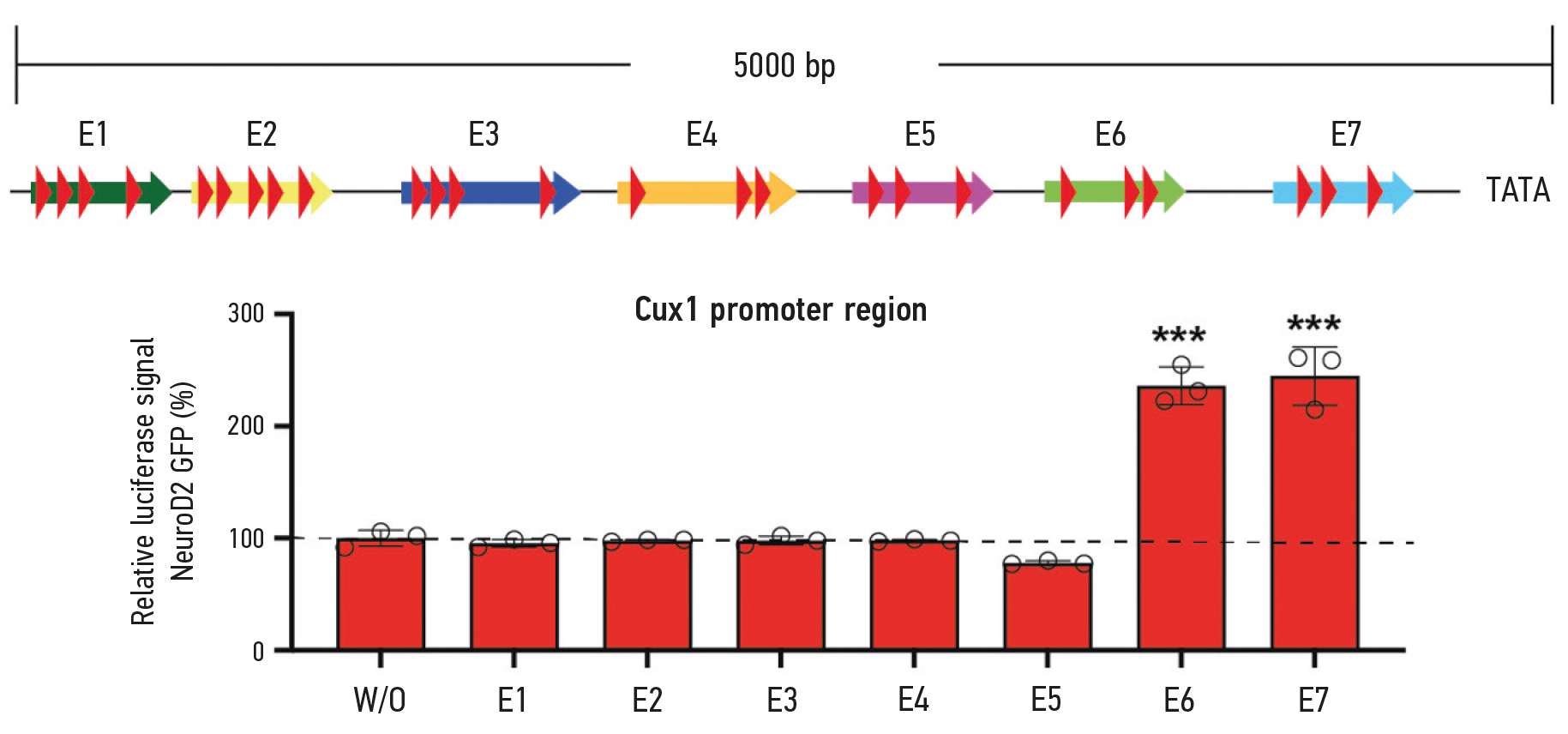 Fig. 4. Luciferase promoter assay of Cux1 5’ regions in HEK293 cells: seven DNA fragments (E1-7 with 290–530 bps lengths) of the genomic region 5 kbp upstream of mouse Cux1 gene were cloned into luciferase expression plasmids (pMCS-GL). Each fragment contains 3–5 E-boxes with the consensus sequence CANNTG (red arrow heads). The bars show normalized luciferase activity in cells (triplicates), co-transfected with pMCS-GL and NeuroD6 relative to cells co-transfected with pMCS-GL and GFP. Transfection with pMCS-GL empty backbone (w/o) was set as 100% baseline. Two most proximal fragments (E6 and E7) to Cux1 transcript start (TATA) remarkably increased the transcriptional activity of NeuroD2: E1=95.53±4.61%, p=0.39; E2=97.99±4.22%, p=0.66; E3=97.98±4.77%, p=0.69; E4=98.05±4.22%, p=0.67; E5=78.17±4.30%, p=0.0071; E6=236.20±10.54%, p=0.0002; E7=244.90±15.62%, p=0.0008 (two-tailed t-test); *** p <0.001.
