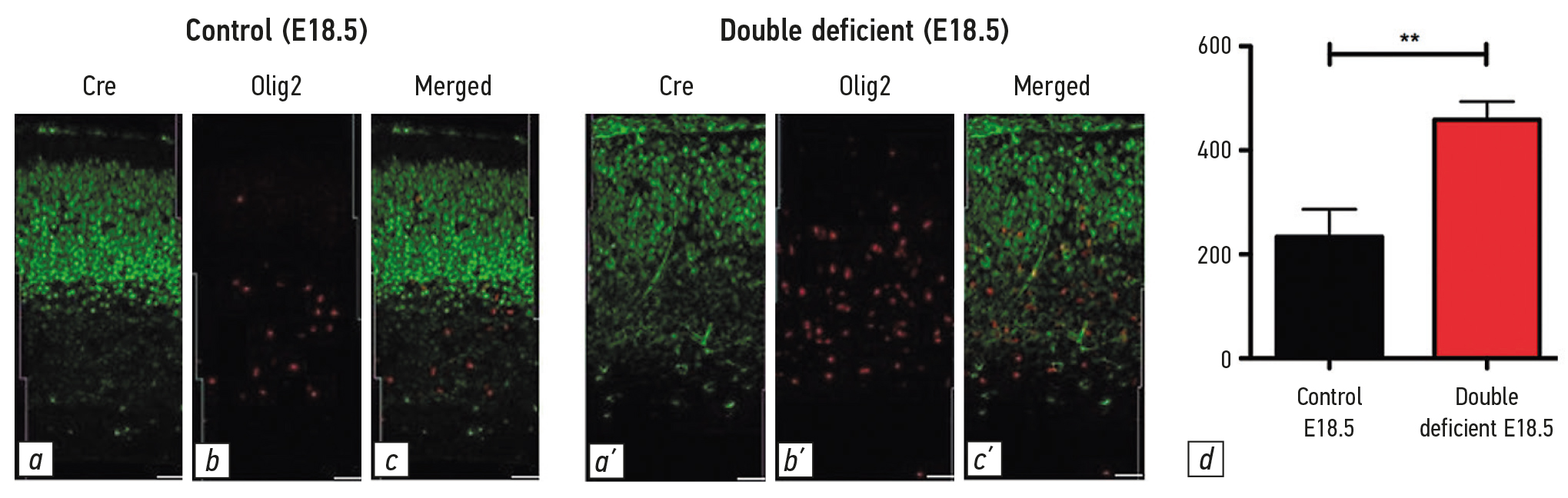 Рис. 5. Инактивация NeuroD2/6 вызывает перепроизводство клеток Olig2+: иммунофлуоресцентное окрашивание на Cre (a, a’) и Olig2 (b, b’) на срезах мозга мышей контрольной группы E18.5 и головного мозга мышей с двойным нокаутом, а также наложение слоев (c, c’). Масштабная линейка: 100 мкм. Количественная оценка Olig2-экспрессирующих клеток (d) в контрольном мозге и мозге мышей с двойным нокаутом на 18-й день эмбрионального развития (n=3). Бар — 100 мкм. 0,001< p <0,01.