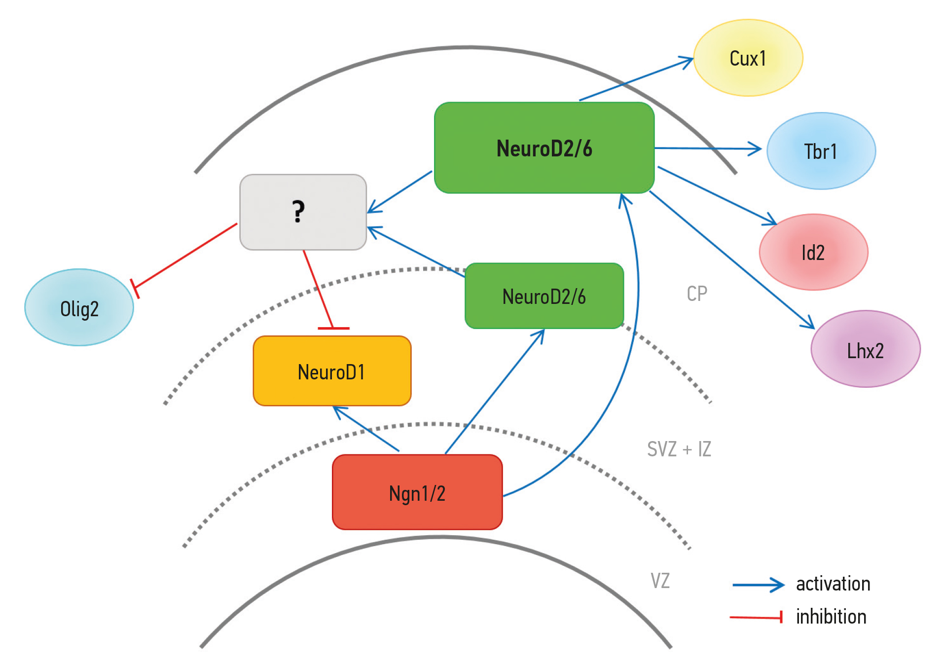 Our findings indicated that the cumulative action of NeuroD2 and NeuroD6 genes is required to initiate and maintain the expression of TFs Cux1, Tbr1, Lhx2, and Id2. Additionally, both genes are required prevention of premature differentiation of Olig2+ glial precursors.