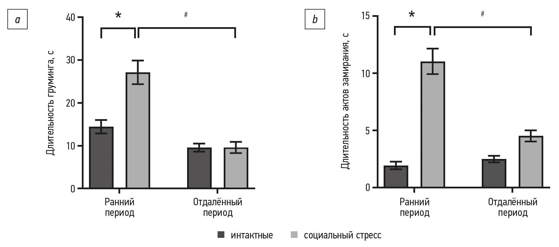 Рис. 4. Суммарная длительность актов груминга (а) и актов замирания (b) в тесте «Открытое поле» мышей линии C57Bl/6 после моделирования хронического социального стресса в инфантильном возрасте; * статистически значимое отличие от значений интактной группы (p <0,0001); # статистически значимое различие между значениями группы социального стресса в раннем и отдалённом периодах (p <0,0001).