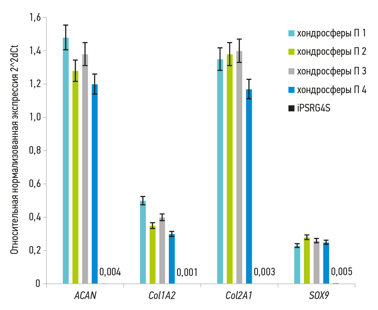 Fig. 1. Relative expression of chondrocyte markers in human chondrocyte lines obtained from different patients (П). iPSRG4S — induced pluripotent stem cells culture (negative control). Gene expression by iPSRG4S cells is shown by numbers in the graph on the right