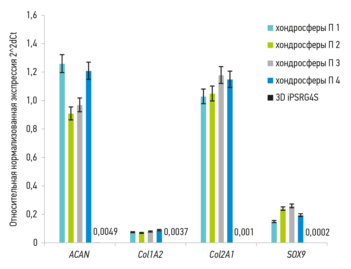 Рис. 2. Относительная нормализованная экспрессия генов хондрогенных маркёров в трёхмерных культурах хондроцитов (хондросферах), полученных из хондроцитов пациентов (П). 3D iPSRG4S — эмбриональные тельца, полученные из культуры индуцированных плюрипотентных стволовых клеток (негативный контроль). Экспрессия генов клетками iPSRG4S показана на графике цифрами справа
