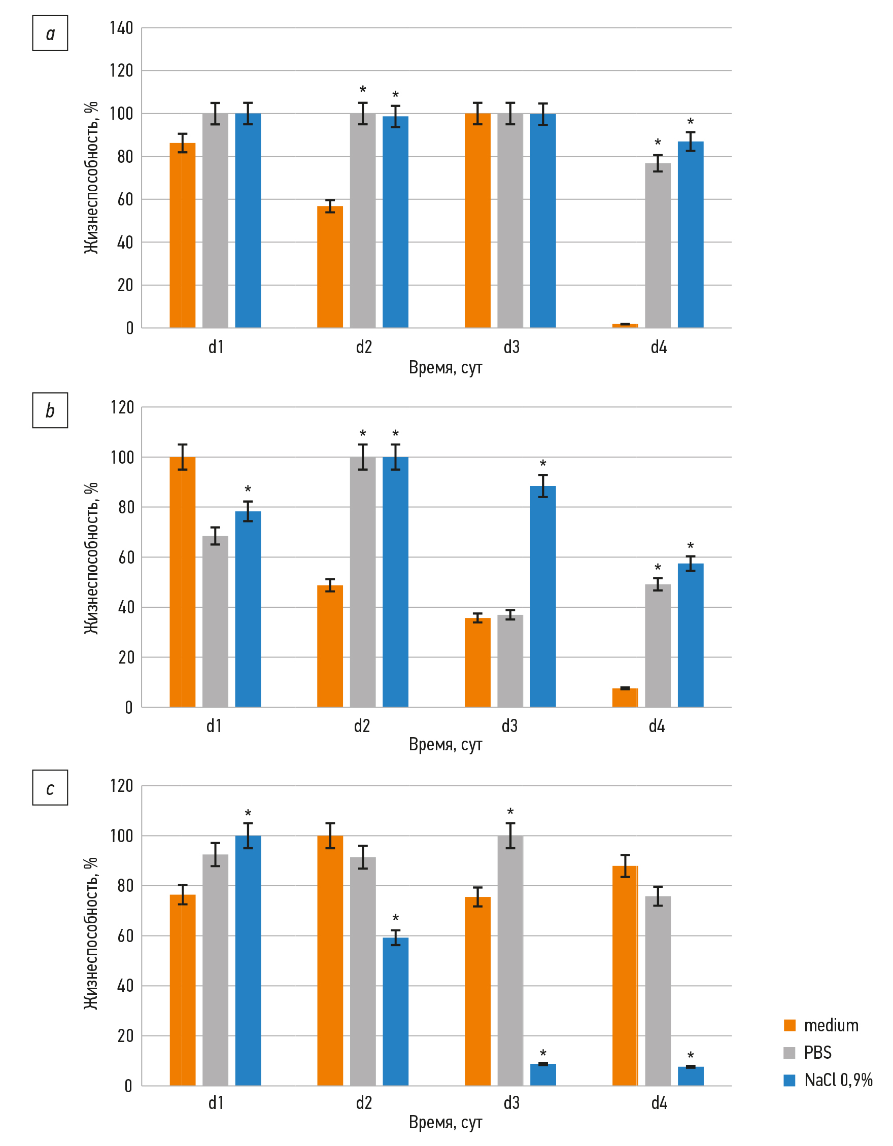 Рис. 3. Жизнеспособность образцов 3D хрящевого имплантата в динамике по времени в зависимости от температуры хранения и сред, % жизнеспособных клеток: а — при температуре +4 °С; b — при температуре +22 °С; с — при температуре +37 °С; d1 — первые сутки, d2 — вторые сутки, d3 — третьи сутки, d4 — четвёртые сутки; medium — питательная среда DMEM/F12, PBS — фосфатно-солевой буфер, 0,9% NaCl — физиологический раствор; * статистически значимые различия по сравнению с использованием среды medium, р <0,05