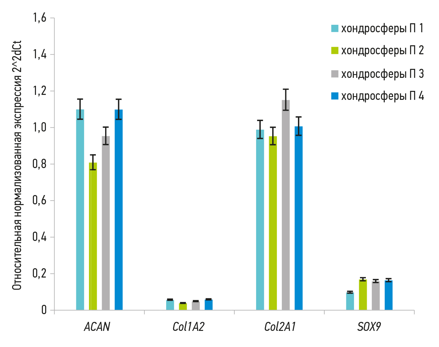 Сравнительный анализ уровня экспрессии хондроцитарных маркёров в хондросферах, полученных из хондроцитов различных пациентов, показал отсутствие статистически значимых различий между культурами (р >0,05) на 35-й день культивирования (рис. 2).
