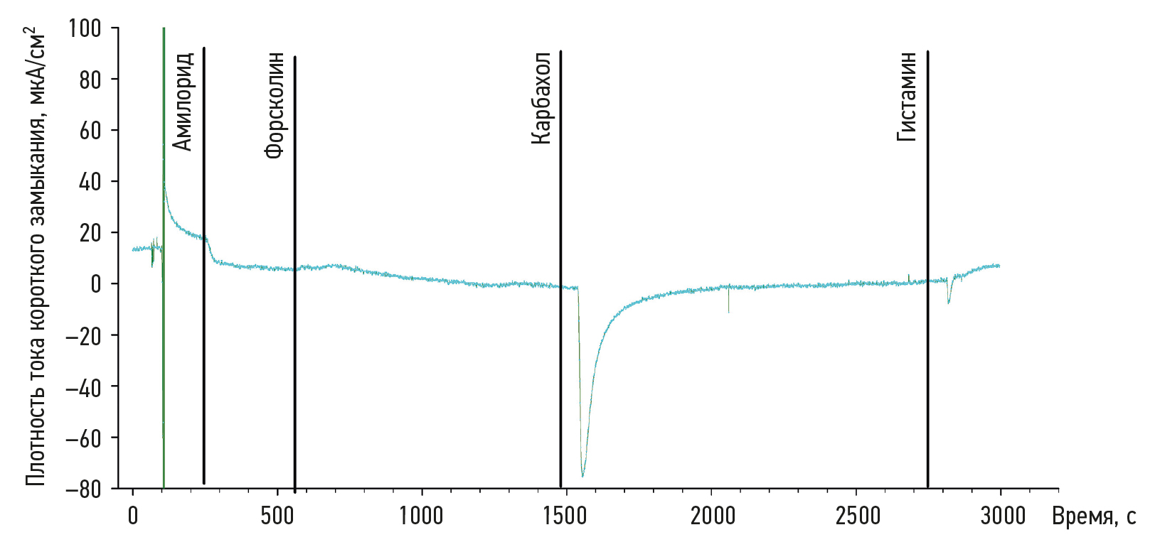 Рис. 2. Результаты измерения плотности тока короткого замыкания у здорового добровольца с функциональным CFTR-каналом (отрицательный контроль). При введении амилорида происходило снижение тока короткого замыкания, в ответ на форсколин — значительное увеличение ΔISC, а при добавлении карбахола и гистамина отмечено изменение тока короткого замыкания в положительную сторону