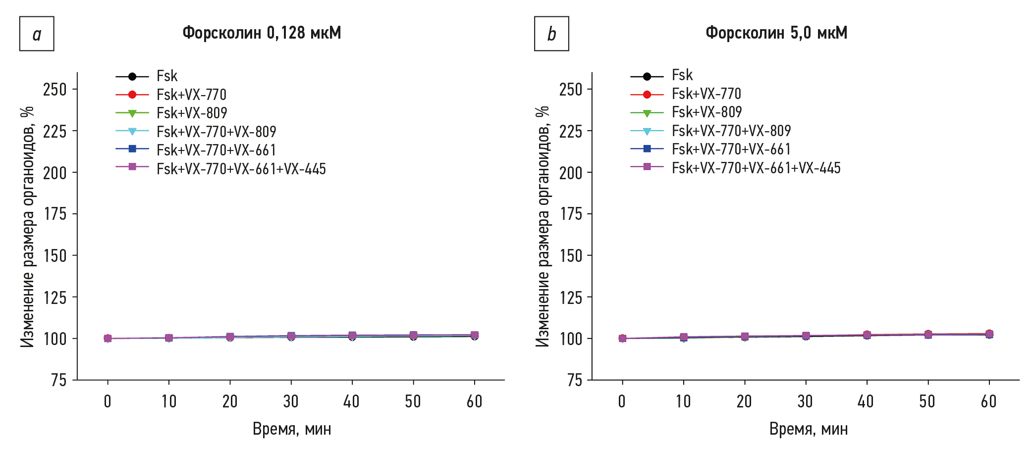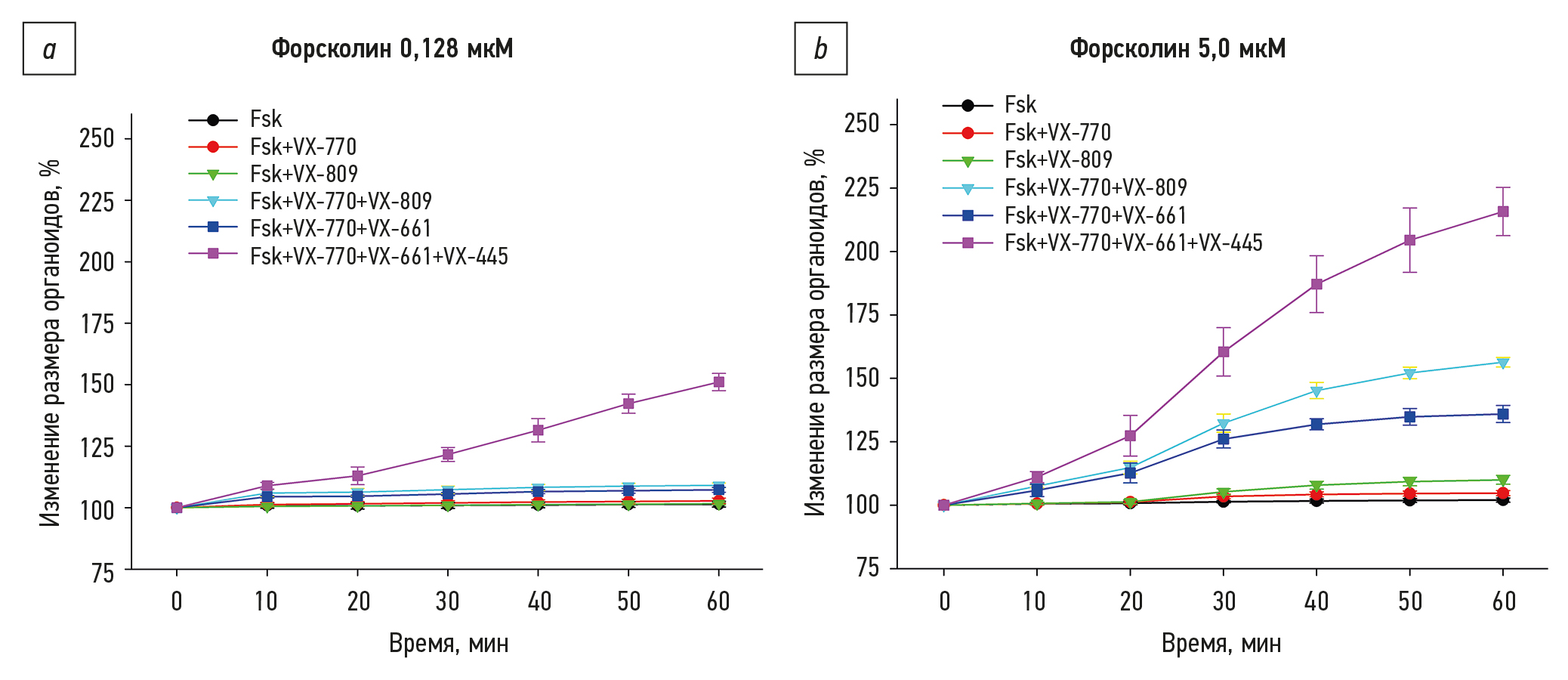 Рис. 6. Количественный анализ набухания контрольной культуры органоидов с генотипом F508del/F508del в ответ на стимуляцию форсколином (Fsk) и таргетными препаратами (VX-770 — ивакафтор, VX-809 — лумакафтор, VX-661 — тезакафтор и VX-445 — элексакафтор): a — ответы при стимуляции 0.128 мкМ форсколина; b — ответы при стимуляции 5,0 мкМ форсколина