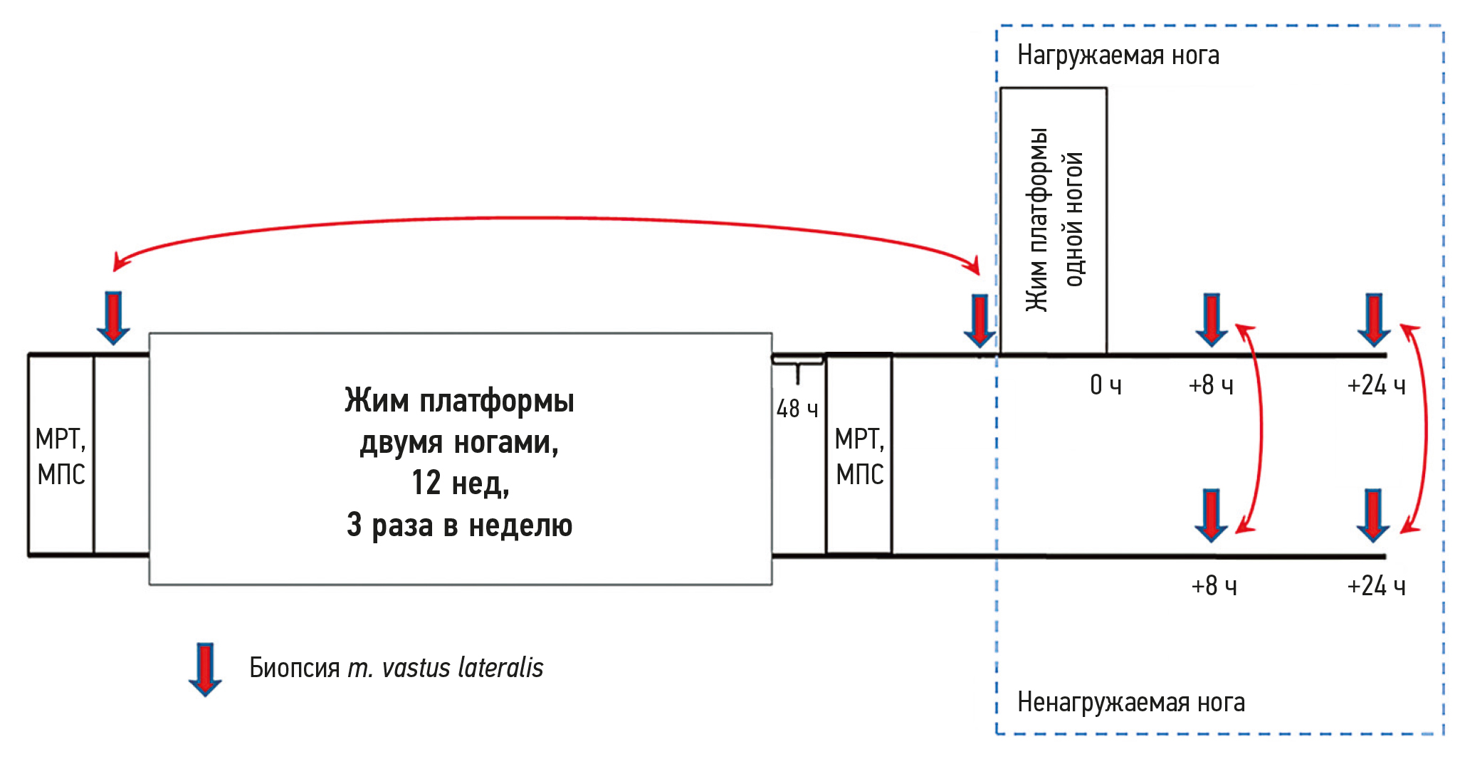 Перед 12-недельной тренировкой проводили магнитно-резонансную томографию (МРТ) обоих бёдер и определяли МПС как наибольшую нагрузку, при которой доброволец мог выполнить полное разгибание обеих ног. Через 48 ч брали биопсию из m. vastus lateralis (рис. 1). МПС оценивали каждые 2–3 нед для коррекции тренировочной нагрузки. Через 48 ч после окончания тренировочного периода проводили МРТ обоих бёдер и определяли МПС обеих ног и одной ноги (случайный выбор), которая через 24 ч нагружалась во время тестового тренировочного занятия (упражнение «жим платформы сидя одной ногой»: разминка (50% МПС, 12 повторов) + 4 подхода (65% МПС, до отказа). Через 8 и 24 ч после окончания тестового тренировочного занятия брали биопсии из m. vastus lateralis работавшей и неработавшей ноги. Процедуру осуществляли после 30 мин покоя в положении лежа из средней трети m. vastus lateralis под локальной анестезией (2 мл 2% лидокаина) с помощью 6 мм модифицированной иглы Бергстрома с аспирацией [25]. Каждую последующую биопсию брали на 4 см проксимальнее предыдущей. Полученные образцы ткани быстро очищали от крови и соединительной ткани, замораживали в жидком азоте и хранили при –80 °С.