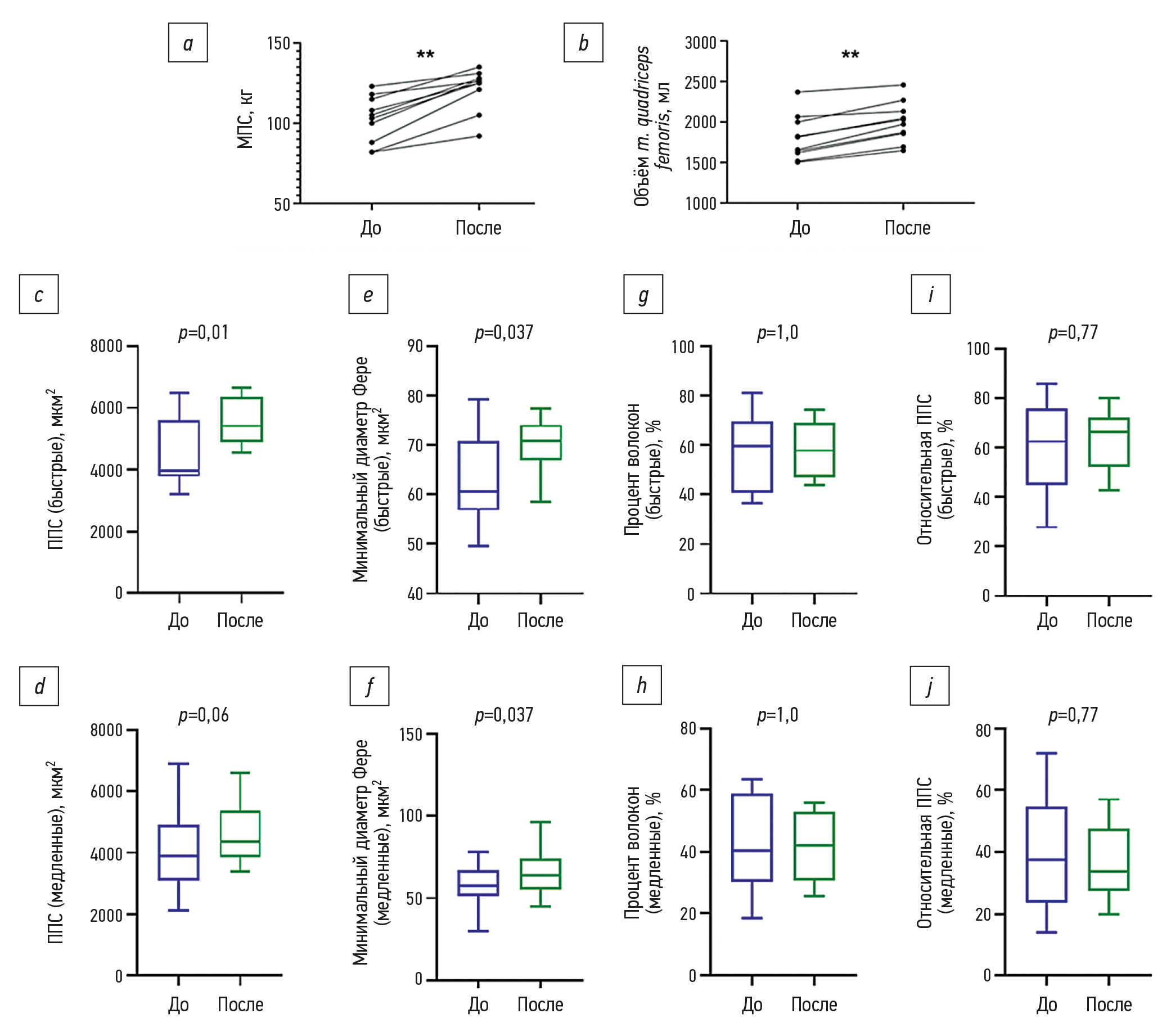 Как и ожидалось, 12 нед силовых тренировок увеличили МПС на 19% (p=0,002; рис. 2, a), объём m. quadriceps femoris — на 12% (p=0,002; рис. 2, b), ППС волокон 2-го (быстрого) типа — на 29% (p=0,01; рис. 2, c) и минимальный диаметр Фере волокон 2-го типа — на 10% (p=0,037; рис. 2, e) и 1-го (медленного) типа — на 13% (p=0,037; рис. 2, f). Наблюдалась тенденция к увеличению ППС волокон 1-го типа на 17% (p=0,06; рис. 2, d). Соотношение и относительная площадь волокон, занимаемая на срезе, не изменились (p=1,0; рис. 2, g, h и p=0,77; рис. 2, i, j соответственно).