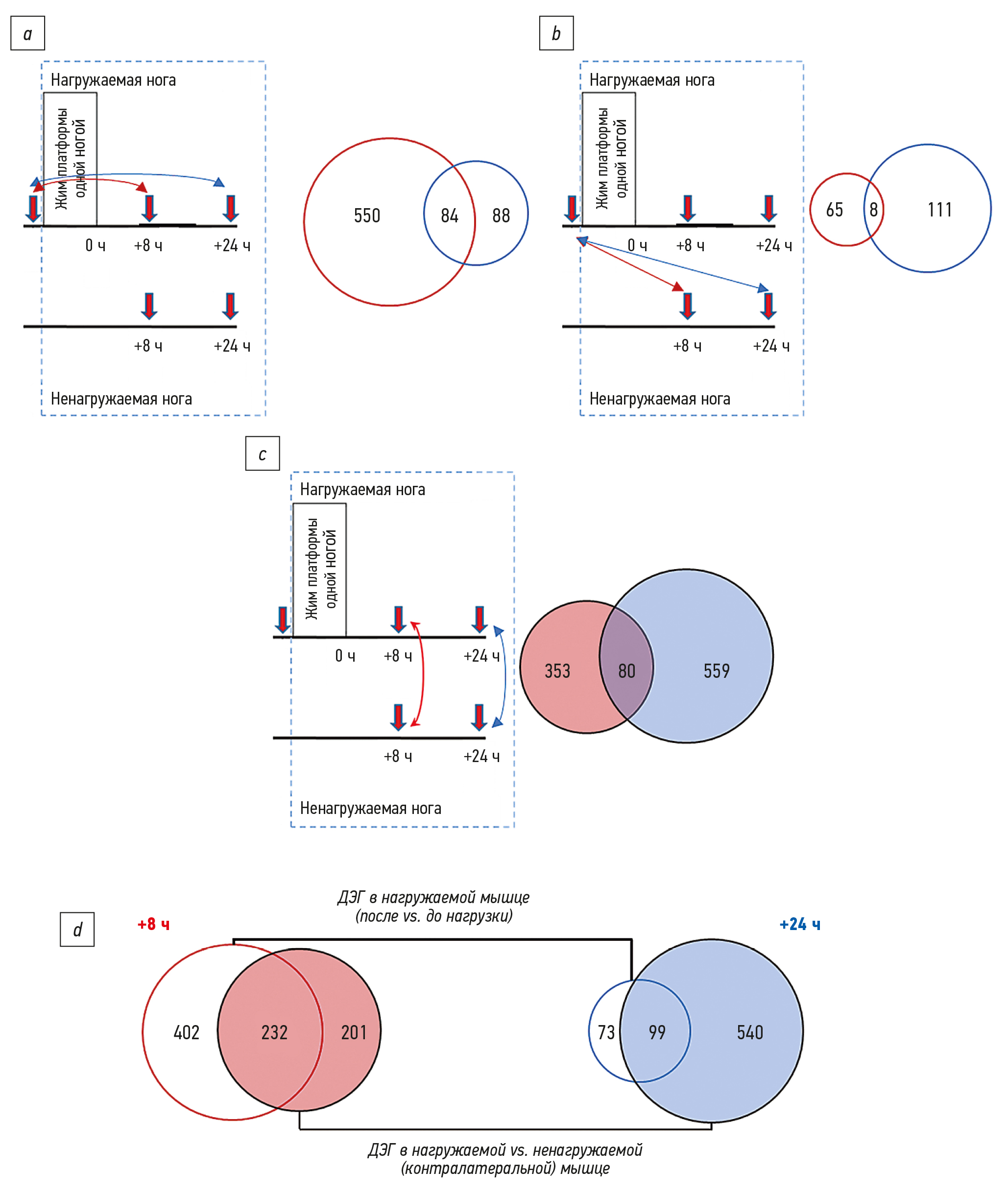 Изменение содержания мРНК является одним из факторов, регулирующим содержание белка. В ряде работ исследовали изменения транскриптома скелетной мышцы человека после регулярных силовых тренировок [8–14] и однократной силовой нагрузки у нетренированных и тренированных людей [9, 13–15]. Изменение содержания мРНК после однократной нагрузки может быть вызвано не только сократительной активностью, но и действием системных факторов (циркадные осцилляции, питание и т.п.). Действительно, было показано, что транскриптом скелетной мышцы грызунов и людей подвержен выраженным циркадным колебаниям, которые включают гены-регуляторы миогенеза [16–19]. Сопоставление транскриптомного ответа на однократную нагрузку в нагружаемой и ненагружаемой (контралатеральной) мышце даёт возможность оценить ответ генов, специфический для сократительной активности, как показано в работе, исследовавшей эффекты аэробной физической нагрузки [20]. В нескольких исследованиях использован такой подход для изучения специфического ответа транскриптома на однократную силовую нагрузку [10, 21]. Однако в этих работах была малая выборка, а ответ на разных временн΄ых точках исследовали у разных добровольцев, что увеличивает вариабельность результатов. Помимо этого, до сих пор не изучена роль изменения транскриптома (изменения базальной экспрессии после регулярных тренировок и специфического ответа генов на однократную нагрузку) в изменении протеома скелетной мышцы после регулярных силовых тренировок.
