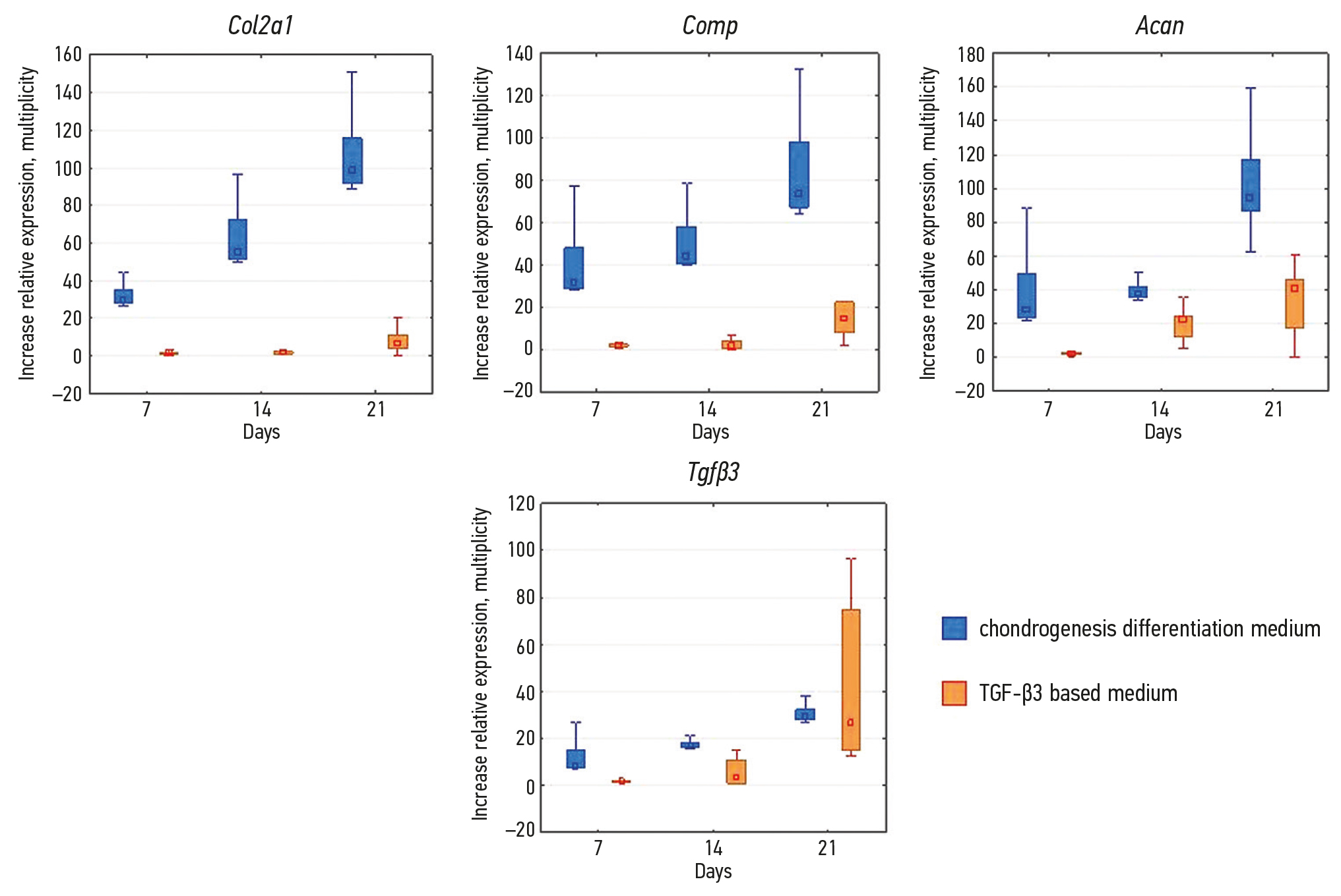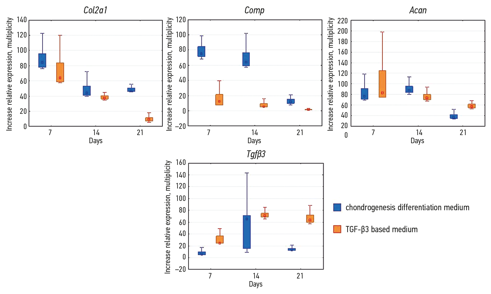 After optimizing the polymerase chain reaction conditions, data on the relative expression of the genes Col2a1, Acan, Comp, and Tgfβ3 were collected. There was a relative increase in the expression of genes responsible for chondrogenesis in both cell lines at all-time points following the addition of both variants of differentiation medium. Figures 1 and 2 illustrate the graphs.