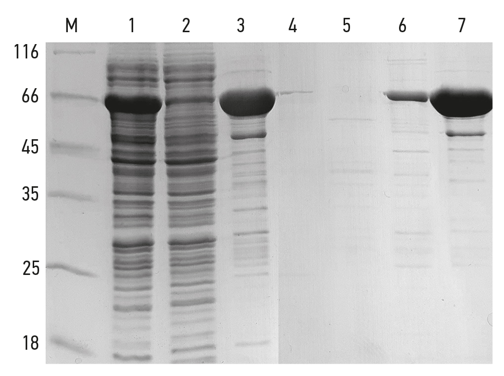 В ходе культивирования клеток E. coli Bl21-gold (DE3) c индуцированной экспрессией рекомбинантного гена показано накопление Bst-pol (~69,4 кДа) в цитоплазматической фракции клеток. За счёт двух стадий хроматографической очистки удалось получить рекомбинантный белок в чистом виде (рис. 1). Для дальнейшей работы использовали фракцию, содержащую наибольшее количество рекомбинантного белка (рис. 1, линия 7). Конечный выход рекомбинантного белка составил около 50 мг на литр бактериальной культуры.