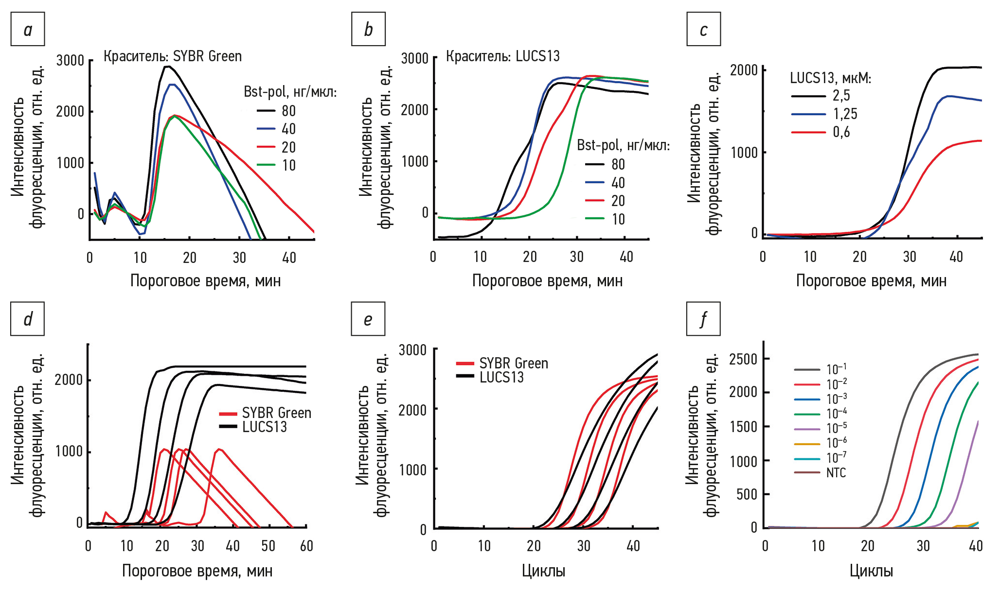 В серии экспериментов по подбору концентрации фермента и интеркалирующего красителя для LAMP и кПЦР применяли праймеры, специфичные к гену бета-актина (ACTB) (см. табл. 2). В качестве интеркалирующего красителя использовали SYBR Green I или LUCS13. Использование SYBR Green I приводит к формированию нехарактерной для изотермической амплификации формы кривой накопления сигнала. Во всех случаях наблюдался сначала небольшой пик, затем провал, за которым следовал большой пик, уходящий в область отрицательных значений (рис. 2, а). В случае LUCS13 кривая накопления сигнала имела классическую S-образную форму (рис. 2, b). При использовании Bst-pol в концентрации 80 нг/мкг наблюдается провал в начале амплификации и дополнительный горб на кривой, исчезающий при меньших концентрациях фермента. Снижение концентрации фермента в два раза меняет форму кривой при сопоставимом значении порогового времени (см. рис. 2, b). При последующем уменьшении количества фермента происходит смещение кривой вправо, что соответствует большему времени реакции. На основании полученных результатов для последующих экспериментов была выбрана концентрация фермента 40 нг/мкл (1 мкг на реакцию), так как в этом случае, с одной стороны, кривая накопления сигнала имеет гладкую форму без заметных артефактов, а с другой стороны — обеспечивает минимально достигнутое время выхода. Далее была подобрана оптимальная концентрация LUCS13 для проведения реакции изотермической амплификации (рис. 2, c). Уменьшение количества красителя в два раза приводит к понижению уровня сигнала, а дальнейшее уменьшение его количества — к небольшому смещению порогового времени в сторону увеличения. Для дальнейших экспериментов использовали 1 мкг Bst-pol и 2,5 мкМ красителя LUCS13. Для прямого сравнения двух красителей в одинаковых условиях амплификации была проведена LAMP серии десятикратных разведений кДНК. Показано, что в случае использования красителя LUCS13 при разведении матрицы наблюдается равномерное смещение кривых накопления сигнала, в то время как при использовании красителя SYBR Green I смещение происходит неравномерно (рис. 2, d). При аналогичном сравнении красителей в случае кПЦР смещение кривых происходит равномерно на одинаковое количество циклов, что характеризуется одинаковой разностью между пороговыми циклами (∆Ct), однако различаются формы кривых в зависимости от красителя (рис. 2, e). В связи с тем, что при кПЦР краситель не сильно влияет на форму кривой накопления, в дальнейшем перешли на использование готовых наборов для кПЦР с красителем qPCRmix-HS-SYBR для упрощения пробоподготовки и повышения воспроизводимости результатов.