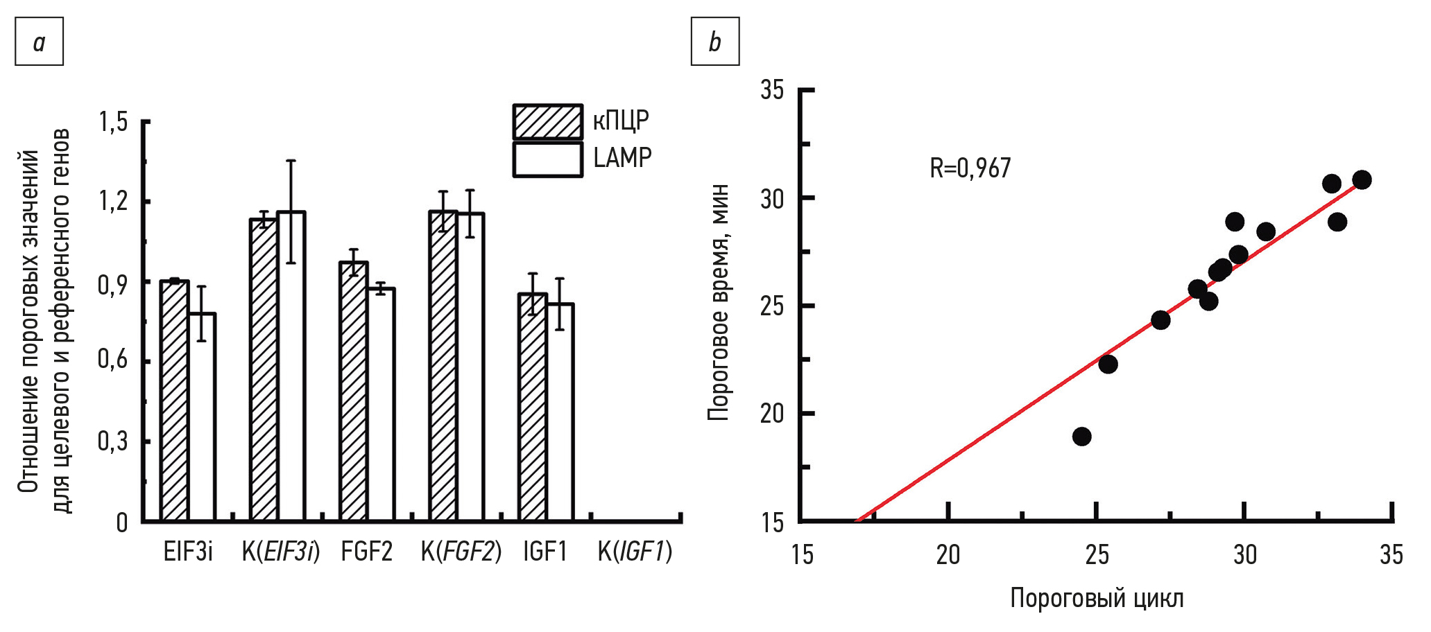 При сравнении двух методов для каждого исследуемого образца получено по два значения: пороговое время/цикл для исследуемого гена и пороговое время/цикл для референсного гена. В качестве матрицы использовали стократное разведение кДНК. Далее для каждого исследуемого гена были рассчитаны отношения значений порогового цикла/времени исследуемого гена к значению референсного гена. Полученные отношения для кПЦР и LAMP для каждого гена сравнивали между собой (рис. 3, а). Статистически значимых различий между используемыми методами не выявлено. Для сравнения двух методов при анализе экспрессии генов ростовых факторов также проводили корреляционный анализ (рис. 3, b). Показан высокий уровень корреляции (96,7%) между данными кПЦР и LAMP, что позволяет использовать метод LAMP для быстрого анализа уровня экспрессии генов. Кроме того, из рисунка 3, b видно, что наибольшее значение порогового времени составляет 31 мин при наибольшем среднем значении 30,7±2,8 мин, что позволяет проводить анализ экспрессии генов в течение 35 мин.