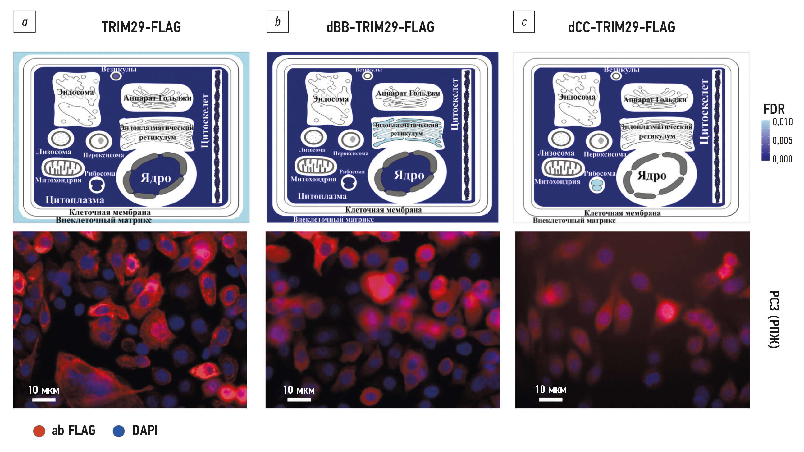 Рис. 2. Влияние функциональных доменов белка TRIM29-FLAG на его локализацию в клетке: верхняя панель — расположение белков-партнёров TRIM29-FLAG и его усечённых форм в компартментах клетки; чем интенсивнее окрашивание, тем значимее обогащение интерактома TRIM29-FLAG или его усечённых форм белками соответствующего компартмента; нижняя панель — иммуноцитохимическое окрашивание антителами, специфичными к пептиду FLAG (обозначено красным цветом) клеточной культуры PC3 со сверхэкспрессией TRIM29-FLAG или его усечённых форм; синим цветом окрашены клеточные ядра (DAPI); вертикальные панели соответствуют сверхэкспрессии полноразмерного белка TRIM29-FLAG и его усечённых форм dBB-TRIM29-FLAG и dCC-TRIM29-FLAG; FDR — false discovery rate (ожидаемая доля ложных отклонений), РПЖ — рак предстательной железы.