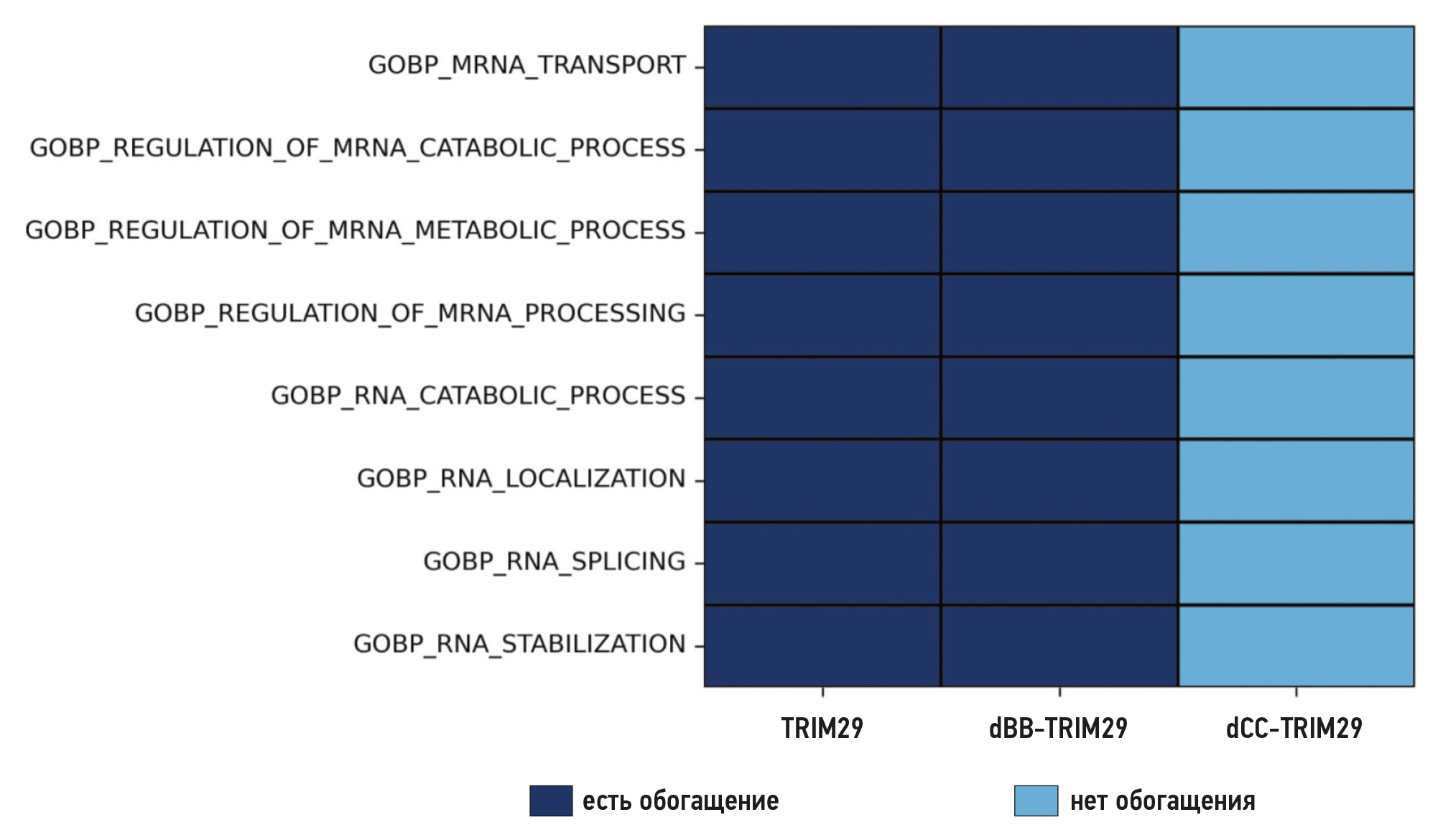 Рис. 4. Тепловая карта, отображающая биологические пути, связанные с процессингом РНК, в которые вовлечены белки-партнёры TRIM29 и его усечённых форм.