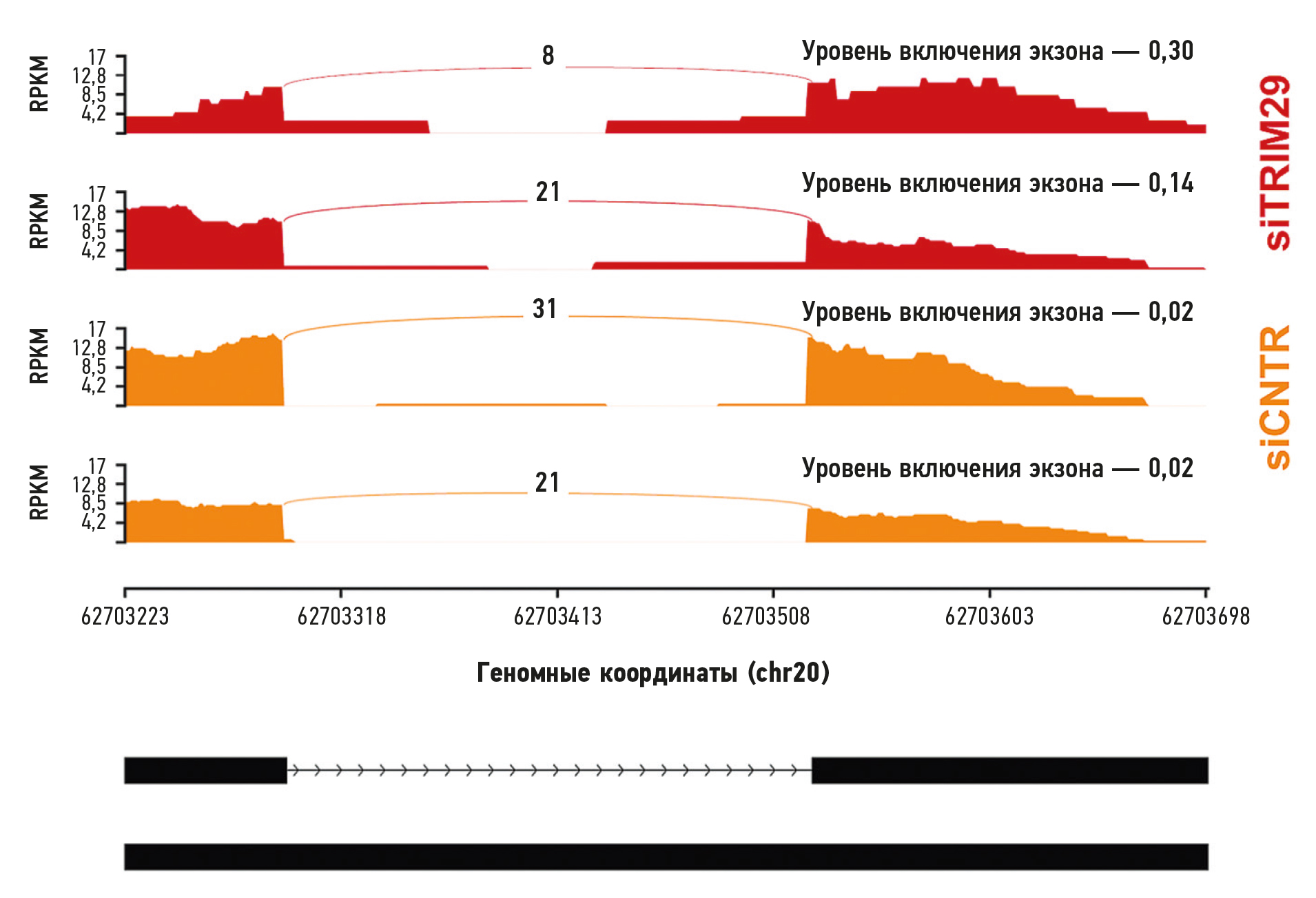 Поиск альтернативных сплайсинговых событий. Данные секвенирования РНК клеточной линии RWPE-1 с нокдауном TRIM29 и без (GSE204811) были картированы на референсный геном версии hg19 с аннотацией генома gencode v37 при помощи программы STAR [14]. Альтернативные сплайсинговые события были определены при помощи программы rMATS [15]. Событие альтернативного сплайсинга считалось значимым, если FDR <0,05 и абсолютное значение разницы включения между группами сравнения больше 0,1. Визуализацию анализа альтернативного сплайсинга проводили при помощи программного пакета rmats2sashimiplot [15].