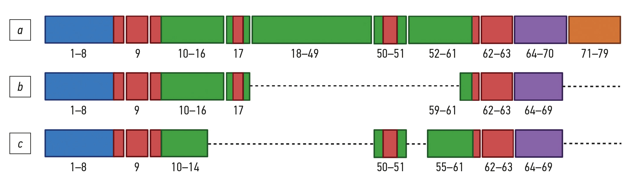 Рис. 2. Схематическое изображение: a — полноразмерного гена DMD; b — укороченной формы гена DMD, используемой в клинических исследованиях компанией Sarepta-Roche; c — укороченной формы гена DMD, используемой в клинических исследованиях компанией Pfizer. Цвет каждого экзона соответствует белковому домену, который он кодирует: актин-связывающий домен выделен синим цветом; шарнирные области — красным; центральный стержневой домен — зелёным; область, богатая цистеином — фиолетовым; а С-концевой домен — оранжевым.