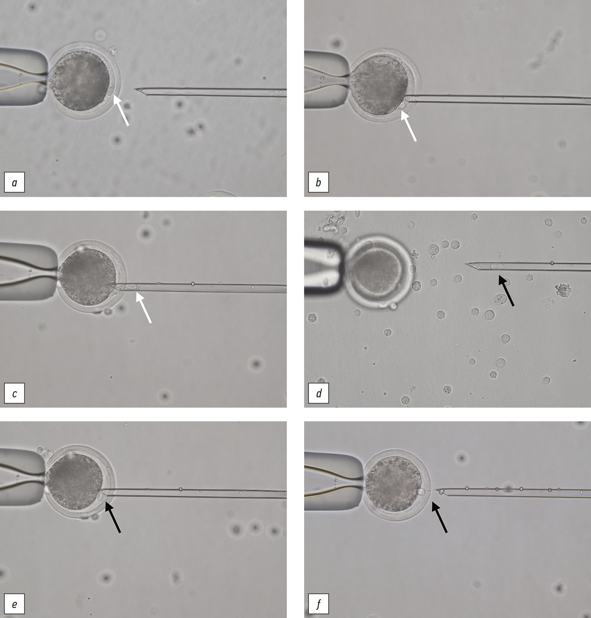 Рис. 1. Микрофотографии ооцитов овец в период проведения процедуры NT (энуклеации ооцитов и переноса в перивителлиновое пространство полученных цитопластов донорской соматической клетки): a — индивидуальное фиксирование ооцита с помощью удерживающей пипетки в поле зрения микроскопа в положении, позволяющем чётко визуализировать первое полярное тельце (ППТ); b–c — энуклеация ооцита; d — захват соматической клетки (СК) микропипеткой; e — перенос СК в перивителлиновое пространство энуклеированного ооцита; f — завершение процедуры NT: получение комплекса ооцит–СК. Микроскоп Eclipse Ti-U (Nikon, Япония). ППТ указаны белыми стрелками, СК — чёрными стрелками; ×200.