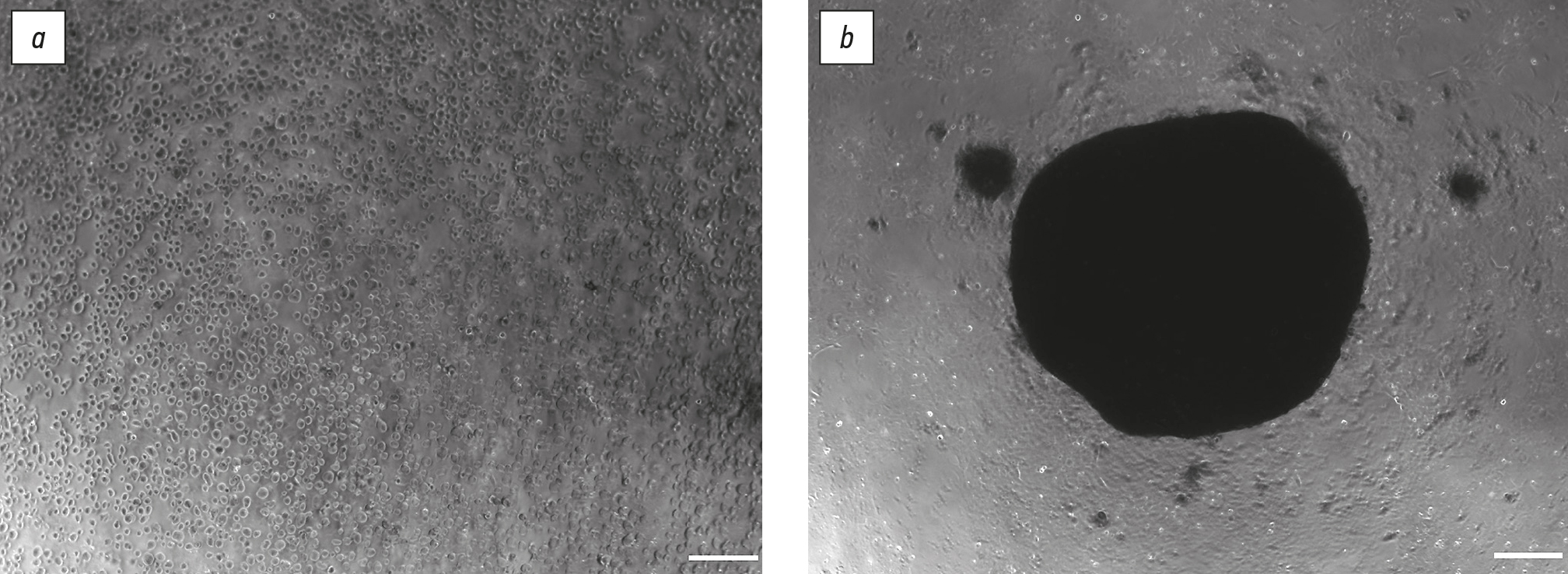 Рис. 2. Процесс формирования сфероида хондроцитов, дифференцированных из индуцированных плюрипотентных стволовых клеток линии IPSRG4S, в лунках 96-луночного планшета: a — начало формирования сфероида; b — сформированный сфероид на 2-й день культивирования. Бар — 200 мкм.