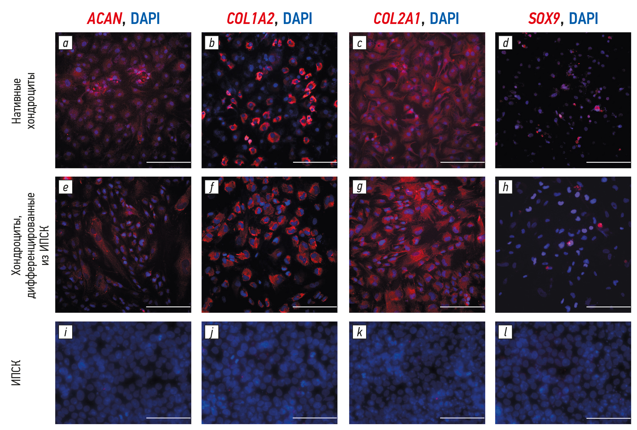 Рис. 3. Иммуноцитохимический анализ хондроцитов, полученных из разных источников. Хондроциты, дифференцированные из индуцированных плюрипотентных стволовых клеток (ИПСК), на 19-й день от начала дифференцировки, демонстрируют схожие уровни экспрессии основных маркёрных генов хондроцитов: e — ACAN; f — COL1A2; g — COL2A1; h — SOX9 — по сравнению с культурой нативных хондроцитов на 2-м пассаже: a — ACAN; b — COL1A2; c — COL2A1; d — SOX9. Клеточная культура ИПСК была взята в качестве отрицательного контроля: i — ACAN; j — COL1A1; k — COL2A1; l — SOX9. Бар — 200 мкм.