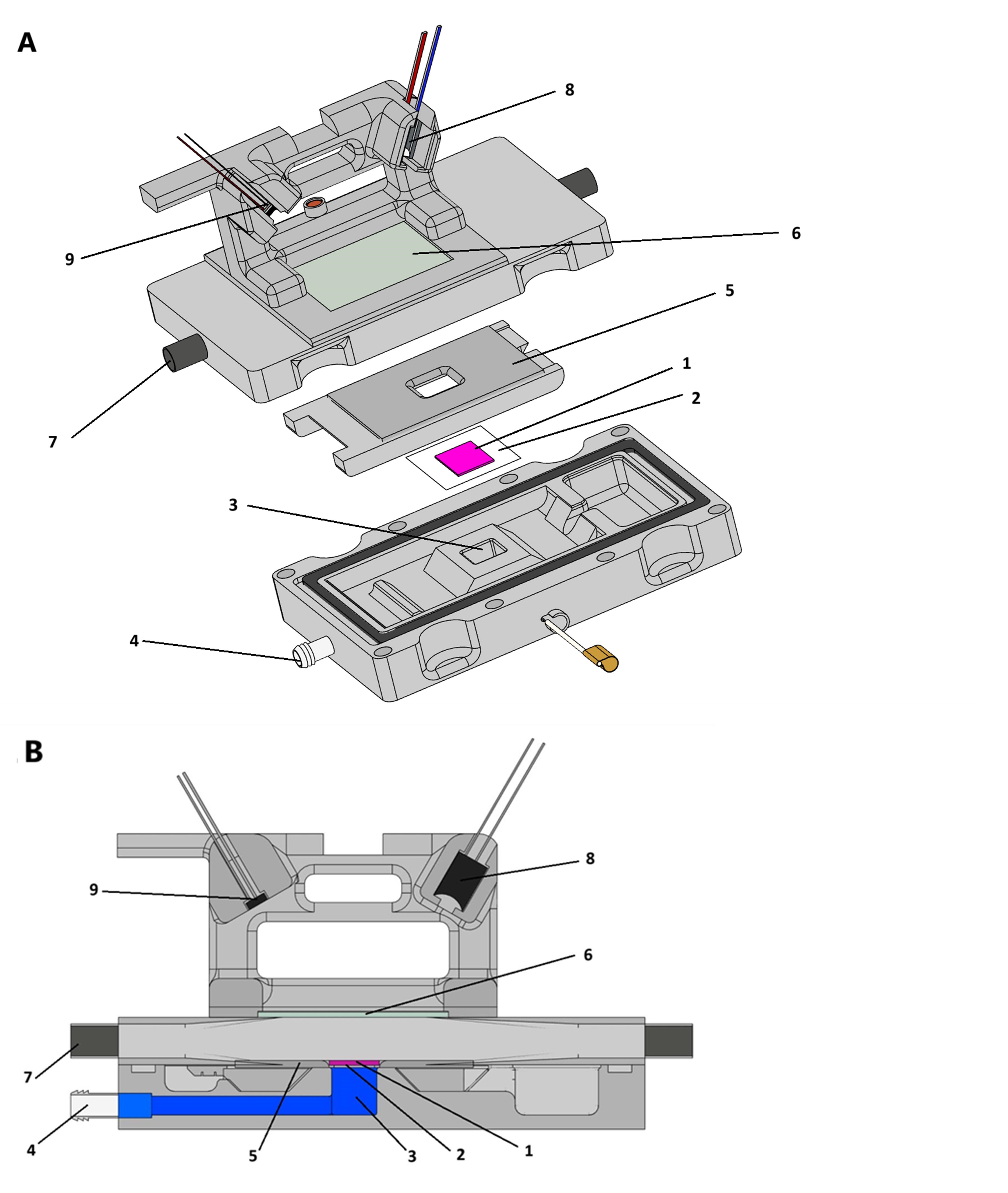 The setup diagram is shown in Fig. 1 (a, exploded view; b, longitudinal section of the chamber). The cell layer (1) is pre-cultured on a porous track membrane made of polyethylene terephthalate with a pore size of 0.4 µm (Reatrak-Filter LLC, Obninsk, Russia) (2). Beneath the porous membrane, there is a reservoir with the culture medium (3) connected via a pipe (4) and a flexible tube to a pressure control system (not shown in the diagram) allowing for controlled and cyclic variations of the pressure applied to the liquid beneath the membrane. The pressure control system consists of a 50 ml plastic container connected to the reservoir (3). The container is mounted on a special holder connected to a movable stage (a stepper motor [Parts Hub Store, China] is connected to the stage via a worm gear). The motor is controlled by an open-source Arduino UNO microcontroller board. Pressure is controlled by creating a height difference between the liquid levels in the movable container and the chamber. The aerosol delivery system over the cell layer includes a quadrangular chamber with the lower wall made of a metal plate (5) and the upper wall made of glass with a conductive coating (6). All plastic components of the chamber are made from dielectric material (AnyCubic Basic Clear polymer resin for 3D printing, China) using an Anycubic photopolymer 3D printer (China). An opening with an area of 1 cm² is made in the lower wall of the chamber, where the porous membrane with cells is placed. At opposite ends of the chamber, there are pipes for aerosol (7). The aerosol flow in the chamber was maintained at a rate of 2 L/min for all experiments. The conductive walls of the chamber were connected to opposite poles of a high-voltage power supply. The reservoir with the culture medium was connected to the metallic part of the lower wall of the chamber using a detachable contact. The electric field was generated in the chamber using a high-voltage power supply VIDN-30 (OST, Russia). It generated a voltage of 10 kV with the negative pole of the power supply connected to the membrane with the cells.