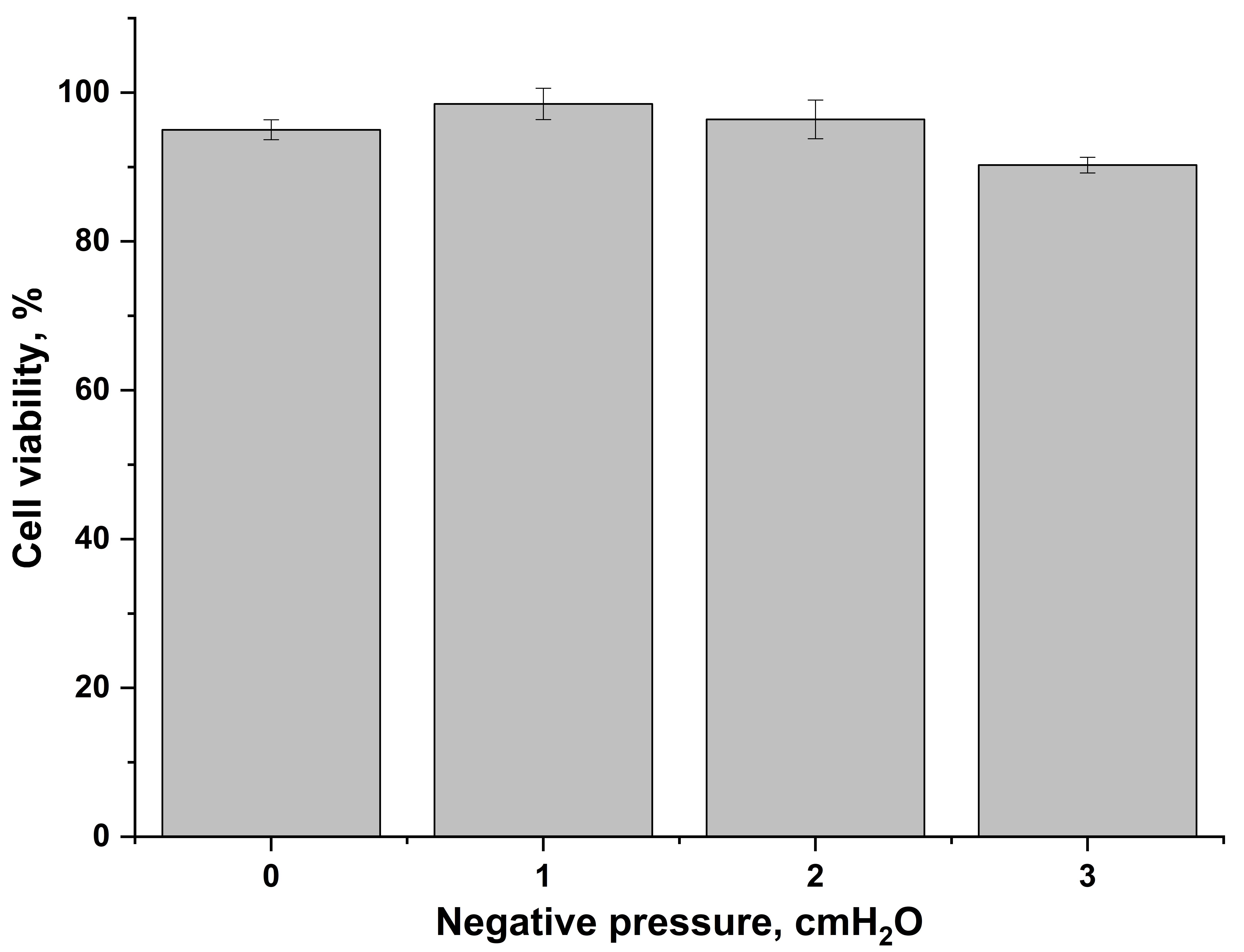 Рис. 2. Зависимость жизнеспособности клеток А549 от величины отрицательного давления, приложенного к жидкости под мембраной при 10-минутной экспозиции в камере для осаждения аэрозоля.