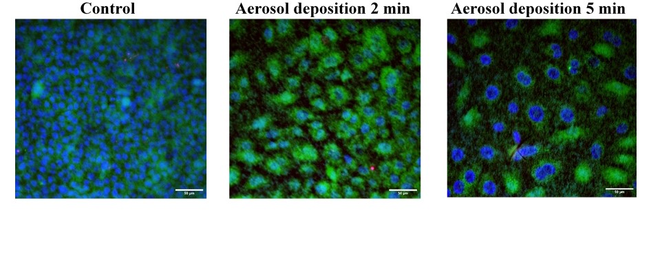 METHODS: The A549 human adenocarcinoma cell line was used as a model culture of pulmonary epithelial cells. Cell viability was analyzed using fluorescent microscopy under various exposure conditions at the liquid–air interface and during the deposition of different aerosol particles.