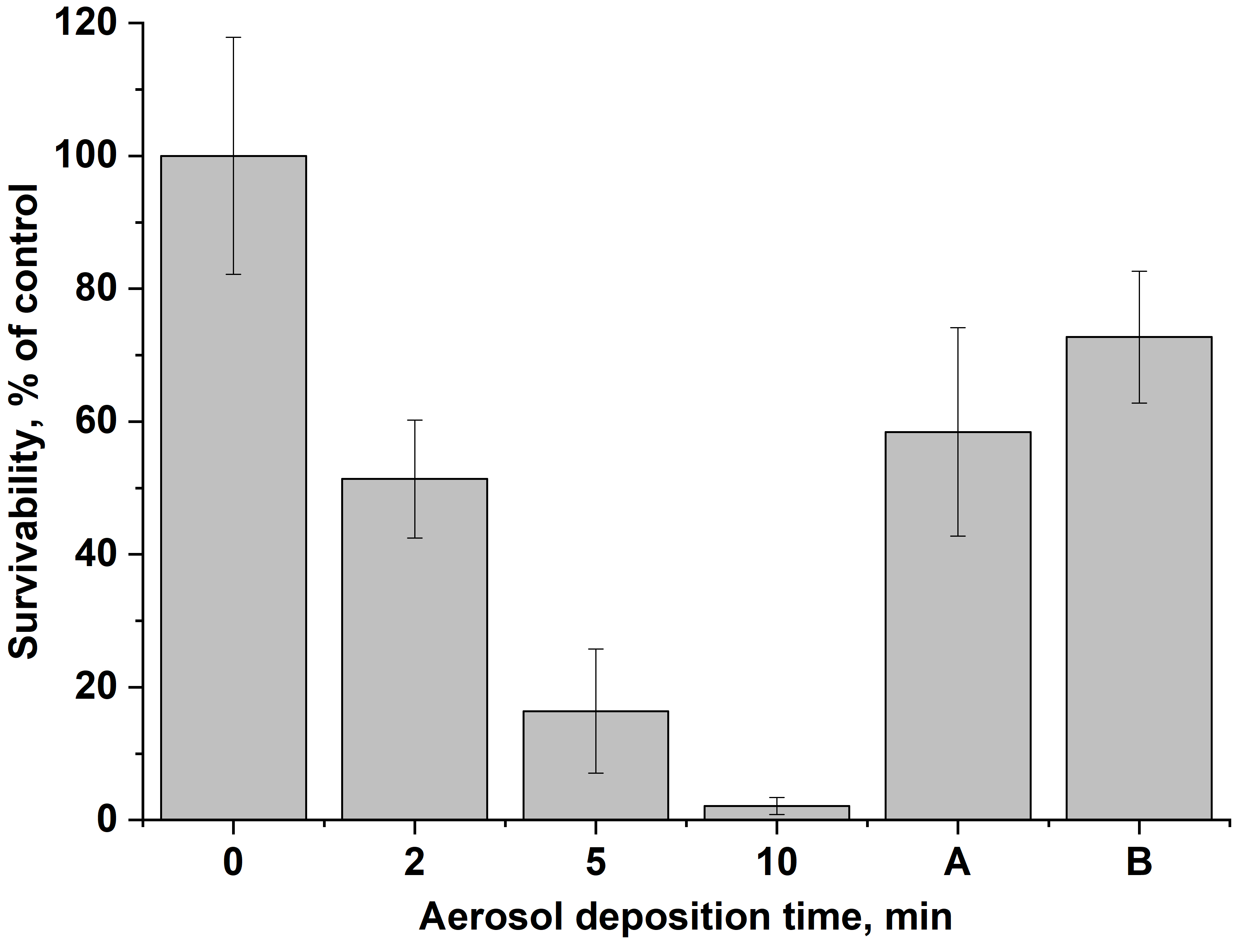 The aerosol deposition effect was also evaluated at a higher cell hydration (the negative pressure applied to the liquid beneath the membrane was changed from 2 to 0.5 cmH2O) without any voltage applied to the chamber. Both modifications of the aerosol deposition conditions resulted in a significant increase in cell survival (see Fig. 8).