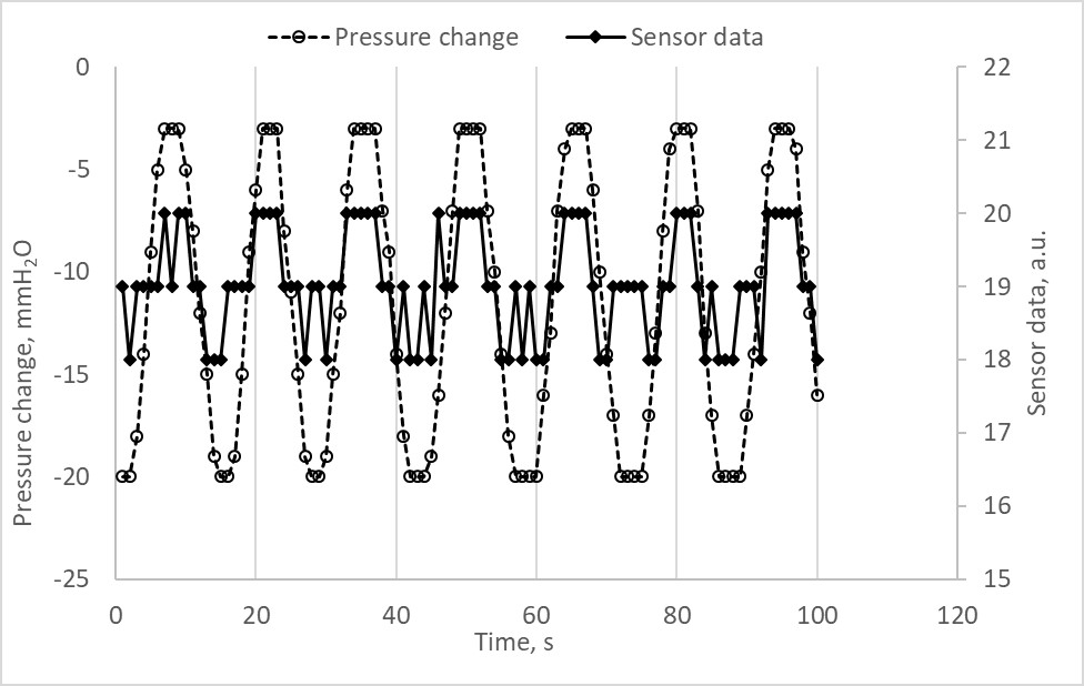 Рис. 9. Зависимость показаний датчика уровня жидкости от приложенного к жидкости под мембраной давления в циклическом режиме. Pressure change — давление, прикладываемое к жидкости под мембраной, Sensor data — показания лазерного датчика обводнённости клеток.