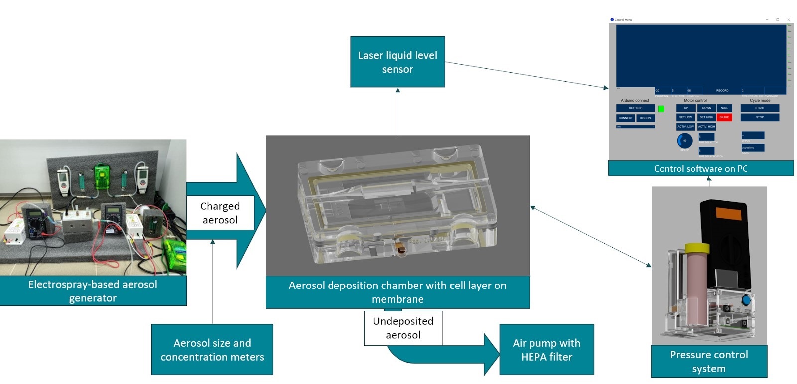In this study, tests were conducted on an experimental lung-on-a-chip platform that simulates the internal surface of pulmonary alveoli. This platform consists of a cell layer located at the air-liquid interface and can simulate the respiratory cycle. To control the cellular immersion in the liquid, the cell layer is cultured on a porous membrane fixed on the surface of a reservoir with the culture medium. The placement of cells on a porous membrane to model distal regions of the lungs has been previously described in the literature [7, 11]. The main difference of the proposed design from the existing alternatives is the method of altering the liquid level above the cells, which involves the pressurization of the culture medium through the pores of a stretch-resistant membrane based on the pressure applied to the liquid beneath the membrane. The membrane is securely fixed on the reservoir surface to prevent deformation. The fixed membrane allows to use an optical sensor, the second important difference of the proposed design from existing models. The setup software allows to control the pressure applied to the liquid beneath the membrane via a personal computer by recording and retrieving real-time readings of the laser sensor measuring hydration level and to implement cyclic pressure variation with specified frequency and amplitude. The connection of conductive walls in the chamber to a high-voltage power supply facilitates the creation of a directed electric field normal to the aerosol flow passing over the cell layer, which is connected to one electrode. The electric field can substantially improve the delivery rate of charged aerosol particles to the cell surface. The charge can be imparted on aerosol particles by interaction with charged air ions generated by a commercial source or electro-spraying in a generator that produces charged nano-aerosol [9, 12]. The diagram of the main components of the experimental setup is shown in Fig. 11.