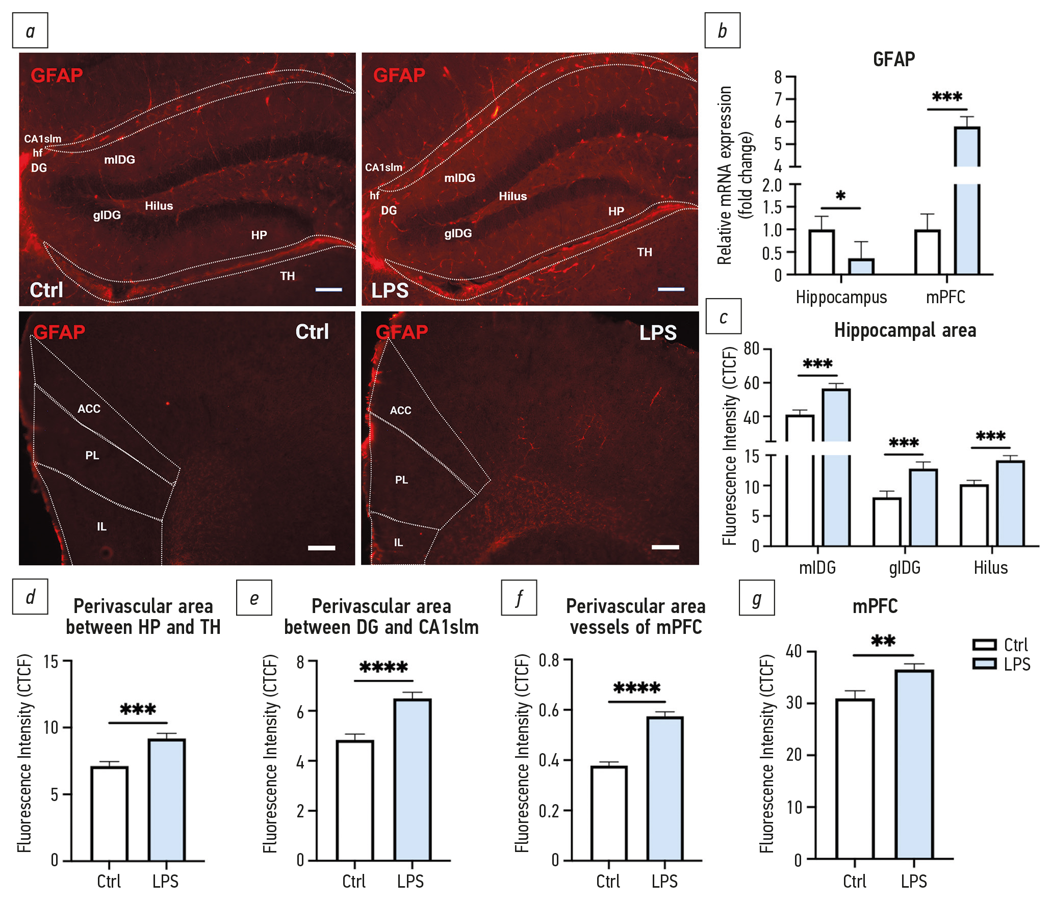 However, gene expression of GFAP, a glial fibrillary acidic protein known as an astrocyte marker, was significantly lower in the hippocampus (p = 0.0101) and higher in the PFC (p = 0.0003). We examined fluorescence intensity of astrocyte marker GFAP+ cells in the hippocampal and medial PFC regions in response to LPS treatment (see Fig. 7). The fluorescence intensity of GFAP+ cells was significantly higher after LPS injections in the molecular layer (mlDG), granular layer (glDG), hilus of the dentate gyrus and the mPFC area compared to controls (p = 0.0005 for mlDG; p = 0.0008 for glDG; p = 0.0003 for hilus; p = 0.0053 for mPFC; see Fig. 7, c, g). In addition, we observed a statistically significant increase in the fluorescence intensity of astrocyte marker GFAP+ cells in the perivascular regions between the hippocampus and thalamus and the perivascular spaces in the mPFC of mice from the LPS group (p = 0.0002 for Fig. 7d; p < 0.0001 for Fig. 7f). We also analyzed CTCF of GFAP+ cells in the perivascular area between DG and CA1slm (p < 0.0001, see Fig. 7e). Similar to Iba1 staining, GFAP staining demonstrated the increased fluorescence in the analyzed regions (see Fig. 7a).
