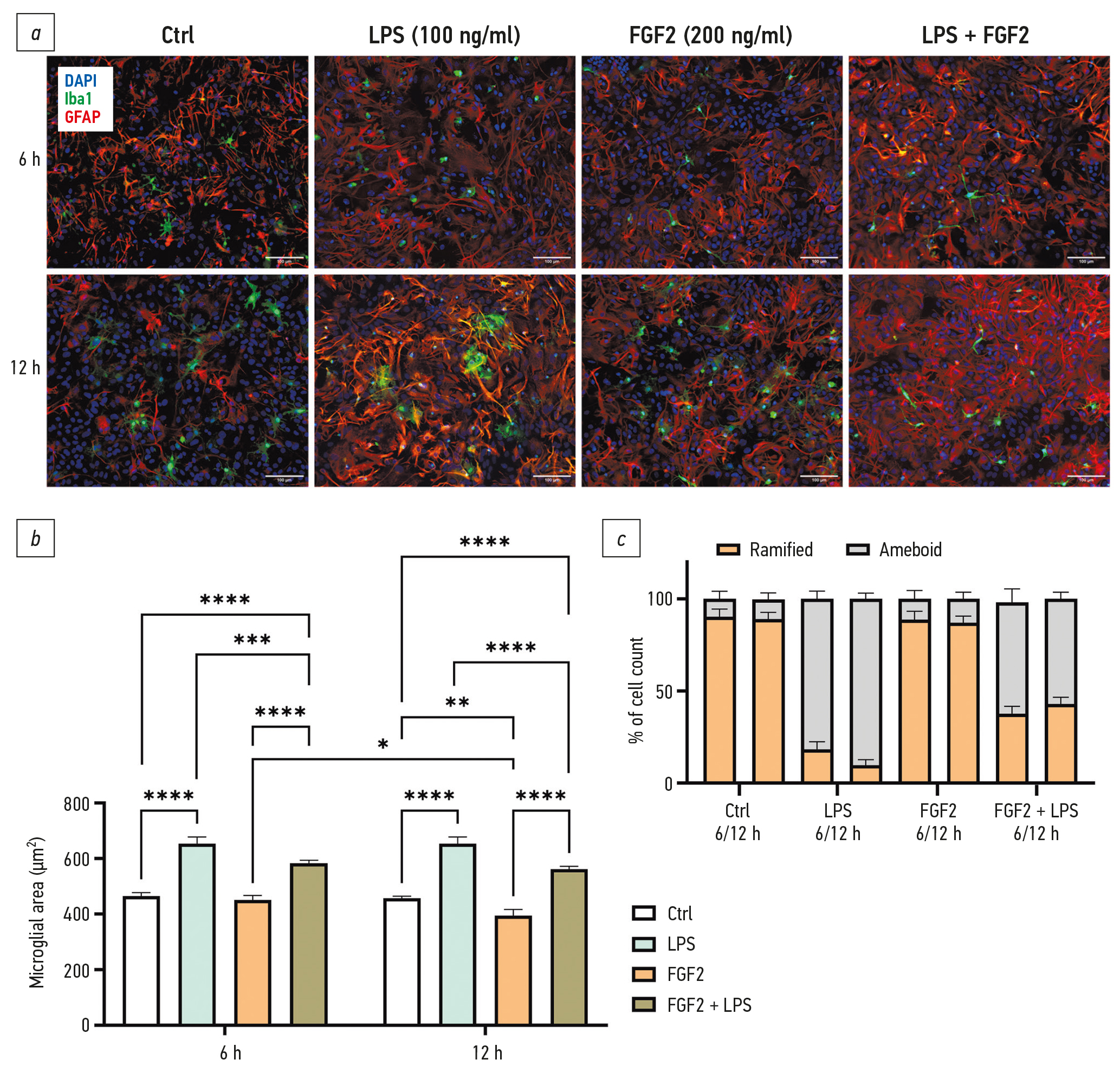 Рис. 8. Процентное соотношение фенотипов микроглии: a, c — в первичной смешанной глиальной культуре мышей под воздействием LPS и FGF2, b — площадь микроглиальных клеток. LPS — липополисахарид, Ctrl — контрольная группа, FGF2 — фактор роста фибробластов 2. Микроглиальные клетки инкубировали с 100 нг/мл LPS и 200 нг/мл FGF2 в течение 6/12 ч. Ramified — разветвленный фенотип, Ameboid — амебоидный фенотип. Бар 100 мкм. Данные представлены как среднее ± SD (n = 3, независимые эксперименты); * p ≤ 0,05; ** p ≤ 0,01; *** p ≤ 0,001; **** p ≤ 0,0001 (двухфакторный тест ANOVA).