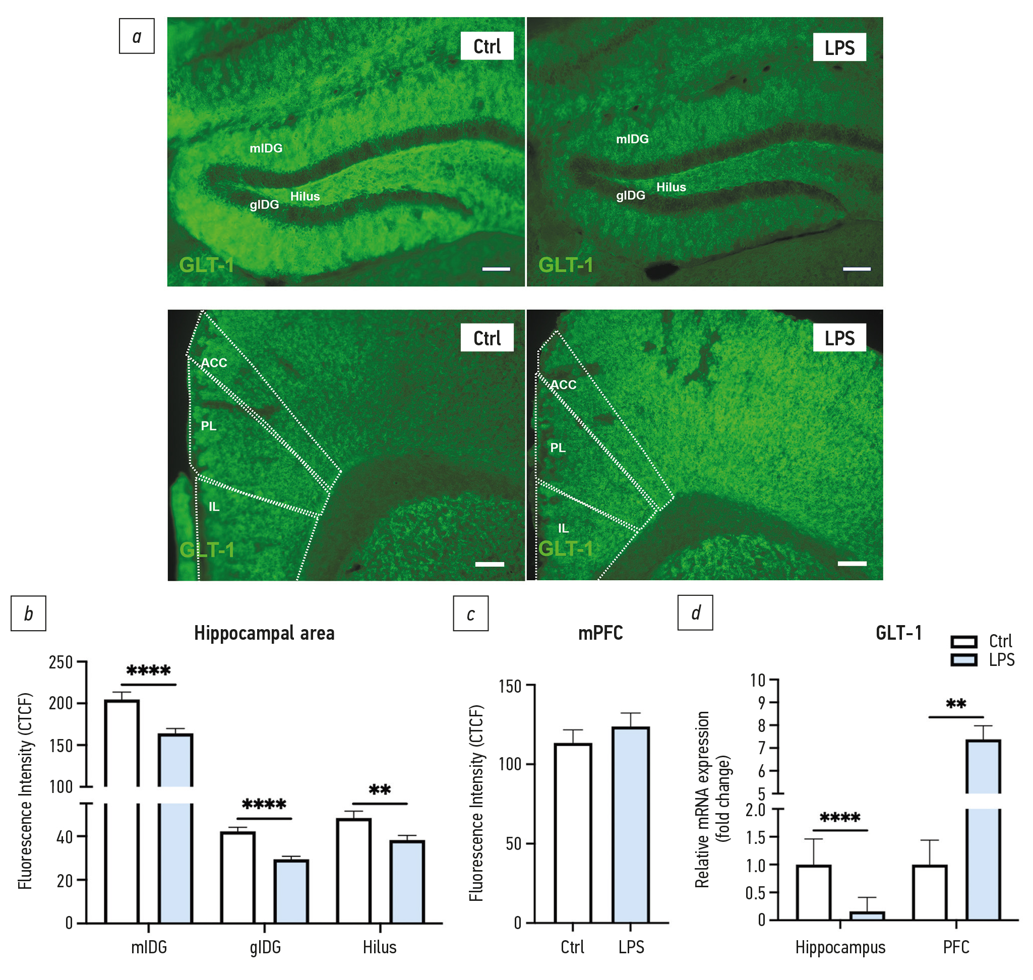 Рис. 7. Интенсивность флуоресценции GFAP+ клеток в ответ на LPS в mlDG, glDG, хилусе гиппокампа, периваскулярной области между HP и TH, периваскулярной области между DG и CA1slm, областях mPFC (ACC, PL, IL) и периваскулярных пространствах mPFC: а — репрезентативные флуоресцентно-микроскопические иммуногистохимические изображения GFAP (красная флуоресценция) в области гиппокампа и mPFC; b — уровень экспрессии GFAP в гиппокампе и префронтальной коре мышей в ответ на хроническое введение LPS; c–e — CTCF GFAP+ клеток в области гиппокампа, периваскулярной области между HP и TH, периваскулярной области между DG и CA1slm; f, g — CTCF GFAP+ клеток в mPFC и периваскулярных пространствах mPFC. LPS — липополисахарид, Ctrl — контрольная группа, GFAP — глиальный фибриллярный кислый белок, HP — гиппокамп, TH — таламус, DG — зубчатая извилина, mlDG — молекулярный слой зубчатой извилины, glDG — гранулярный слой зубчатой извилины, CA1slm — stratum lacunosum-moleculare поля CA1, hf — гиппокампальная щель, mPFC — медиальная префронтальная кора, ACC — передняя поясная кора, PL — прелимбическая кора, IL — инфралимбическая кора, n = 9/10 (Ctrl/LPS) для рис. b, n = 10/9 (Ctrl/LPS) для рис. c–g. Бар 100 мкм для области гиппокампа, 200 мкм для mPFC. Данные представлены как средние ± SEM; * p ≤ 0,05; ** p ≤ 0,01; *** p ≤ 0,001; **** p ≤ 0,0001 (t-тест, тест Манна–Уитни).