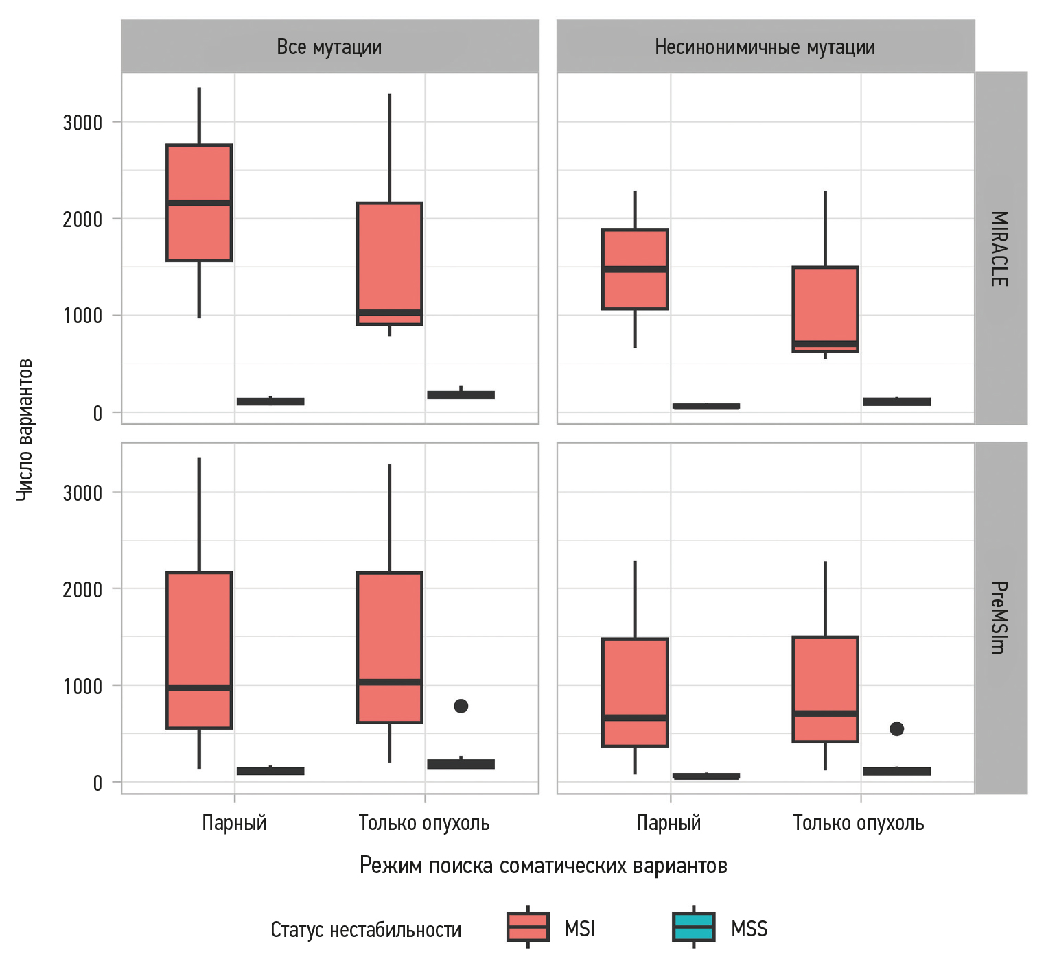Первичный контроль качества как транскриптомных, так и экзомных прочтений проводили с использованием программы FastQC (Babraham Bioinformatics, Великобритания). Утилитой cutadapt [7] удаляли участки низкокачественного чтения с 3’-концов прочтений, а также остатки адаптеров секвенирования. С помощью программы BWA-MEM проводили выравнивание экзомных прочтений, а с помощью программы STAR [8] — выравнивание транскриптомных прочтений на референсный геном человека версии GRCh38 (вариант GRCh38.d1.vd1) с использованием аннотации GENCODE v. 43. Маркировку дубликатов выполняли с помощью утилиты MarkDuplicates из программного пакета Picard (Broad Institute, США). Для транскриптома прочтения, отнесённые к участкам сплайсинга, разбивали на участки непрерывного выравнивания с помощью модуля SplitNCigarReads программного пакета GATK (Broad Institute, США) [9]. Рекалибровку значений качества чтения производили с помощью утилиты BaseRecalibrator (GATK). Для выявления соматических вариантов в образцах транскриптома опухоли применяли программу Mutect2 (GATK) в двух вариантах: с использованием парных образцов экзома крови (режим tumor-normal, «парный») и без них (режим tumor only, «только опухоль»). В обоих случаях для дополнительной фильтрации ошибочно идентифицированных (артефактных) вариантов применяли Panel of Normals (PoN) — данные секвенирования РНК 46 образцов нормальной ткани кишечника (кишечные органоиды) из открытых источников данных (датасет GSE165512 из базы данных Gene Expression Omnibus [10]). Аннотацию полученных вариантов производили с помощью пакета программ ANNOVAR [11]. Убирали варианты, не прошедшие внутренний фильтр программы Mutect2, а также варианты, поддержанные менее чем 4 прочтениями или в позициях, покрытых менее чем 7 прочтениями. Исключали также варианты, встречающиеся более чем в 2 образцах исследуемой выборки и при этом отсутствующие в базе данных соматических мутаций COSMIC, а также однонуклеотидные инсерции в гомополимерных участках. При анализе без использования парных образцов экзома крови также исключали мутации, популяционная частота которых в геномной или экзомной выборке базы данных gnomAD v. 4.0 была выше 0,001. Для определения статуса MSI опухоли по данным секвенирования транскриптома использовали утилиты MIRACLE [12] и PreMSIm [13]. Визуализация результатов проводилась в среде R с использованием пакета ggplot2. Значимость различий между группами MSI и MSS определяли с помощью рангового теста Краскела–Уоллиса для групп разного размера.