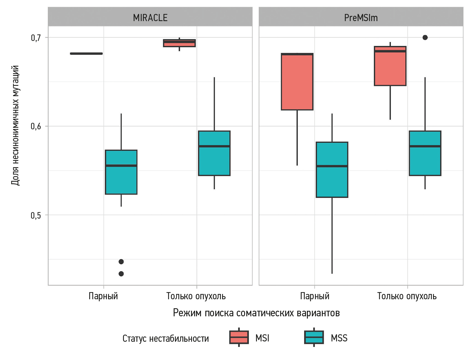 Fig. 2. Association between the fraction of nonsynonymous mutations and microsatellite instability status identified by MIRACLE and PreMSIm tools in colorectal cancer samples (n = 13). MSI — microsatellite instability, MSS — microsatellite stability.