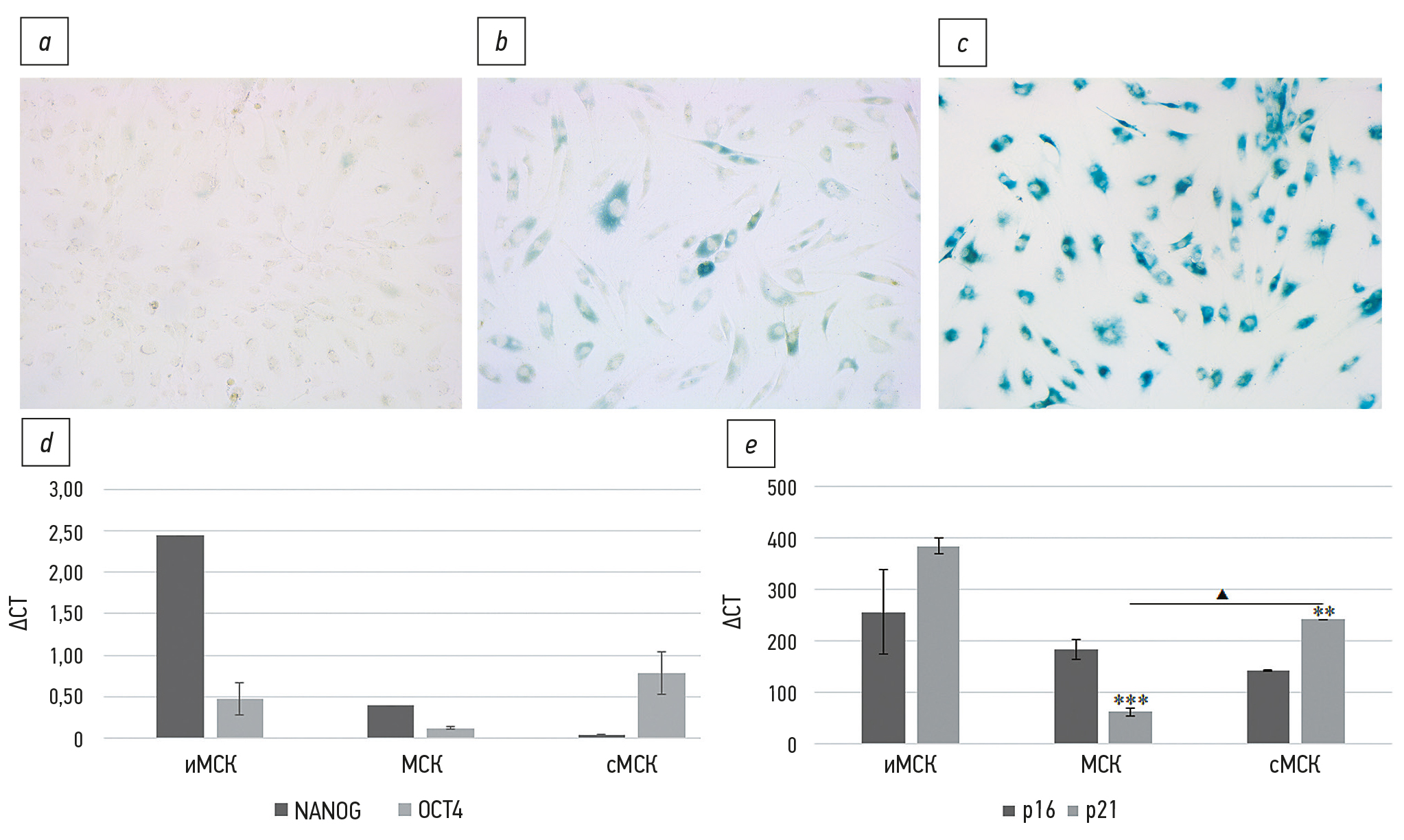 Рис. 1. Определение сенесцентных клеток у пациентов с помощью окраски на активность β-галактозидазы: a — иммортализованные мезенхимные стволовые/стромальные клетки (иМСК), b — МСК, c — МСК от пожилого пациента (сенесцентные, сМСК), а также с помощью оценки экспрессии биомаркеров плюрипотентности (NANOG, OCT4) в иМСК, МСК и сМСК (d) и оценки экспрессии биомаркеров клеточного старения (p16, p21) в иМСК, МСК и сМСК (e). Данные графиков (d) и (e) получены с помощью полимеразной цепной реакции с обратной транскрипцией в реальном времени с нормировкой на ген домашнего хозяйства (RPLP0). Данные представлены как среднее значение со стандартным отклонением, а статистические значимые различия между группами обозначены следующим образом: ** и ▲ p < 0,05; *** p < 0,005. Сравнение, обозначенное **, приведено относительно иМСК.
