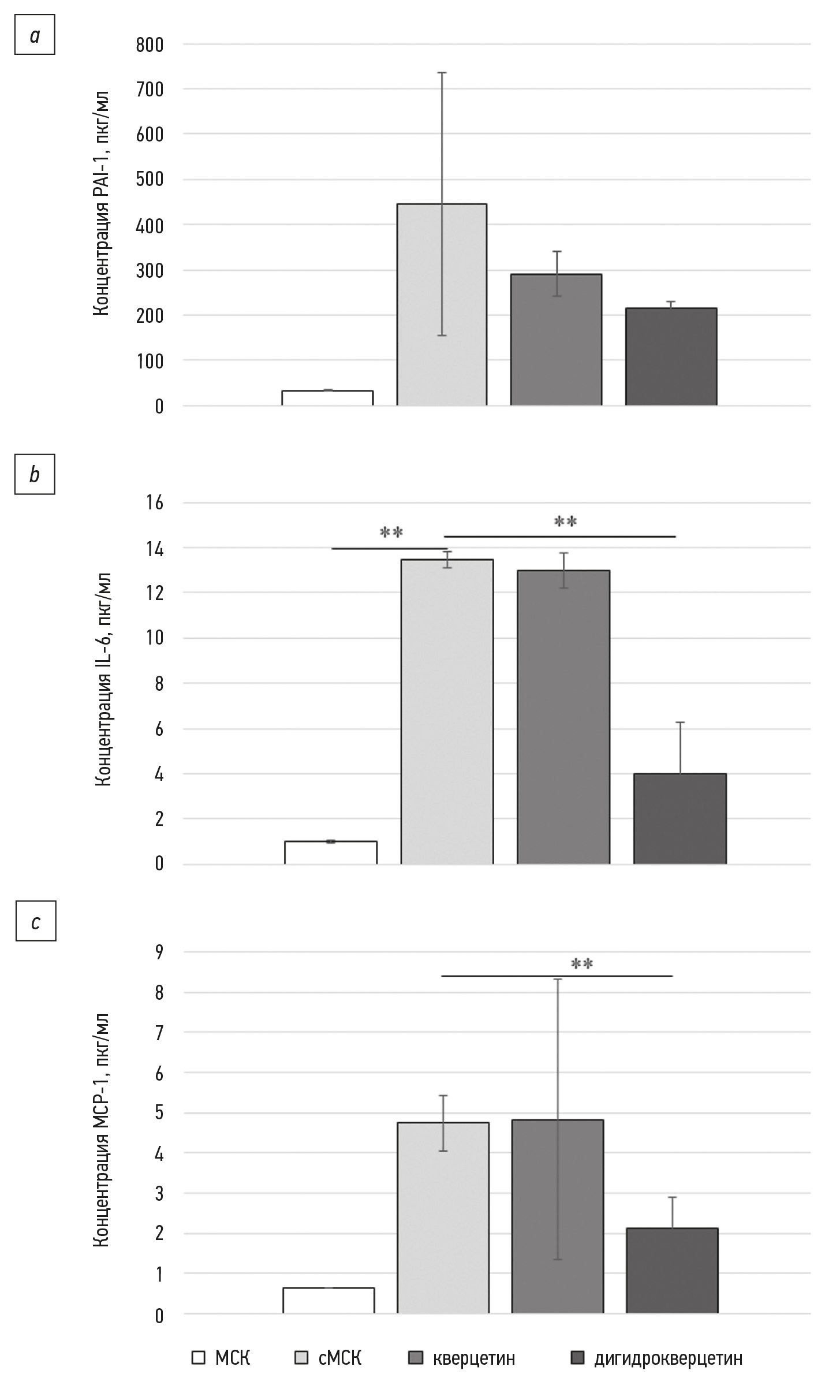 Fig. 2. Differences in senescence-associated secretory phenotype components in the conditioned medium of senolytic-treated senescent mesenchymal stem/stromal cells: a, difference in plasminogen activator inhibitor-1; b, difference in interleukin 6; c, difference in monocytic chemotactic protein-1 in the conditioned medium between the experimental groups. The data are presented as means and standard deviations, whereas statistically significant differences between the groups are indicated as **, p < 0.05. МСК, mesenchymal stem/stromal cells from young donors; сМСК, senescent MSCs obtained from elderly donors; кверцитин, quercetin-treated sMSCs; дигидрокверцитин, dihydroquercetin-treated sMSCs.