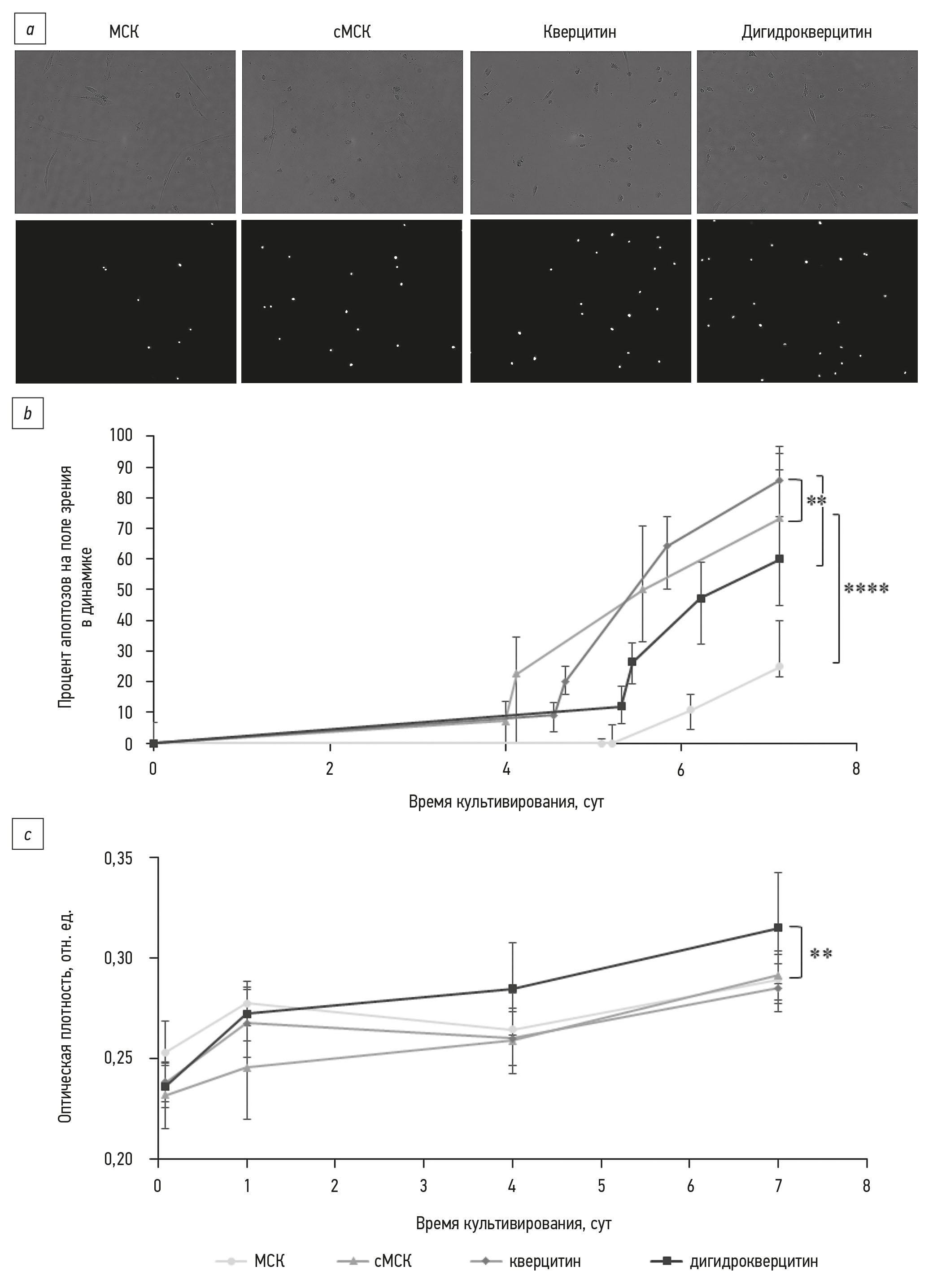 Fig. 3. Evaluation of the effects of senolytics on apoptosis and viability of primary senescent mesenchymal stem/stromal cells: a, micrographs on the 7th day of cultivation in the senolytic medium; upper panel, phase contrast images of cells; lower panel, dead cell nuclear staining with ethidium homodimer-1 (×10); b, evaluation of the number of apoptotic cells relative to the total number of cells in the field of view during the 7-day cultivation, expressed as a percentage; c, cell viability during the 7-day cultivation in senolytic medium (XTT assay). The data are presented as medians and interquartile ranges [25%; 75%] for the plot b, and as means and standard deviations for the plot c, whereas statistically significant differences between the experimental and control groups (untreated mesenchymal stem/stromal cells and senescent mesenchymal stem/stromal cells) are indicated as follows: **, p < 0.05; ****, p < 0.0001. МСК, mesenchymal stem/stromal cells from young donors; сМСК, senescent MSCs obtained from elderly donors; кверцитин, quercetin-treated sMSCs; дигидрокверцитин, dihydroquercetin-treated sMSCs.