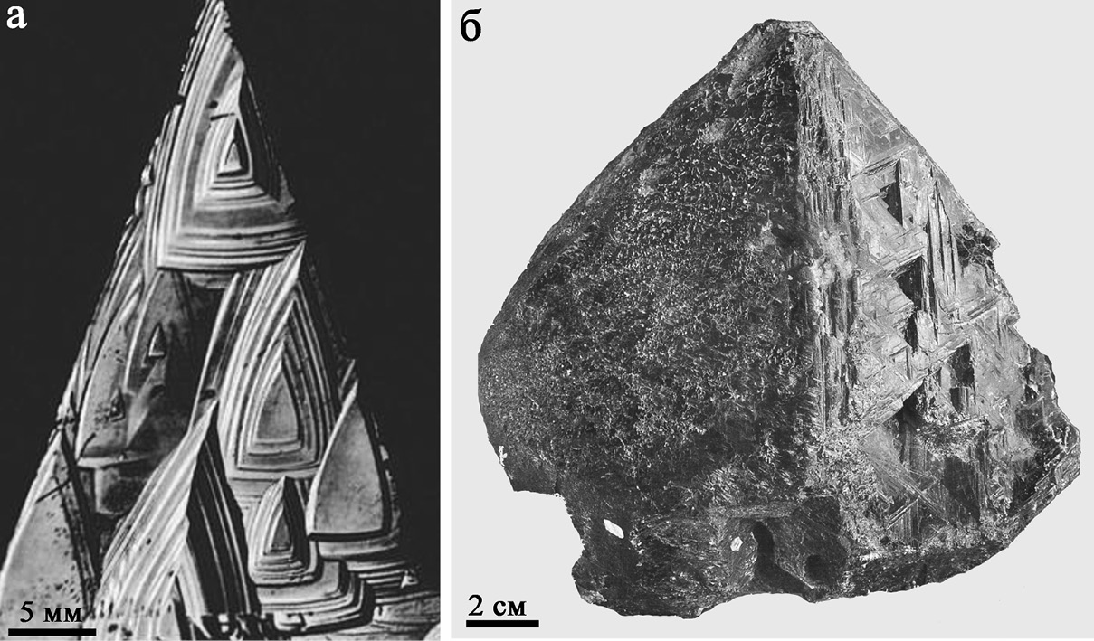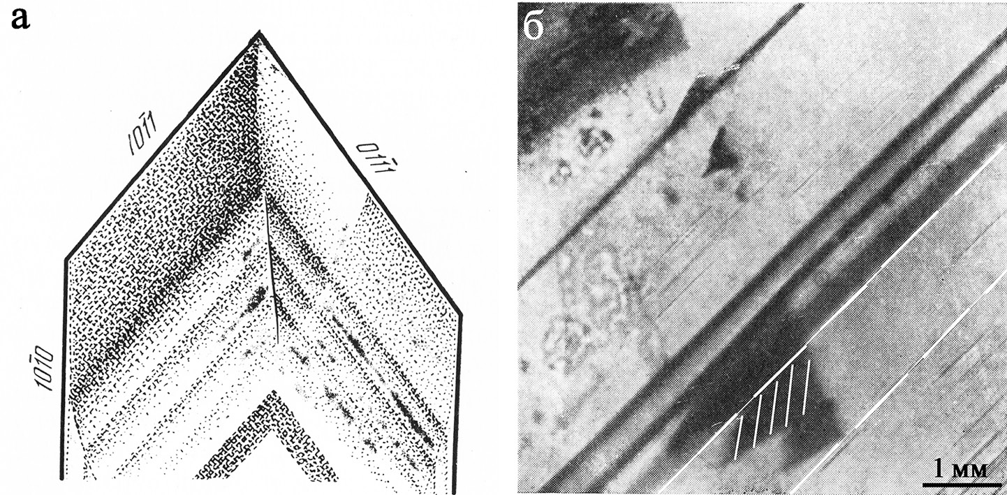 По-видимому, первым, кто дал кристаллографическое объяснение этому явлению на примере кристаллов кварца, был минералог Г.Г. Леммлейн (1973), показавший значение ростовой скульптуры, вицинальных пирамид нарастания и двойников для состава крупных зон роста кристаллов (рис. 3, 4).