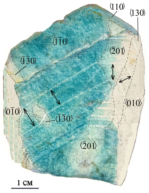Секториально-зональная окраска в кристаллах амазонита известна давно, но долгое время такие амазониты назывались «пятнистыми». На Орловском месторождении в Забайкалье были обнаружены кристаллы калиевого полевого шпата, в которых тонкие зоны роста были как бы подчеркнуты белыми кристаллами альбита и ярко выделялись на фоне пятнистого амазонита (рис. 6). Стало ясно, что белые пятна являются пирамидами нарастания граней {010} и {130}, а зелено-голубые – пирамиды нарастания граней {110}. В процессе кристаллизации грани разных простых форм {hkl} по-разному захватывали Pb-предцентры окраски.