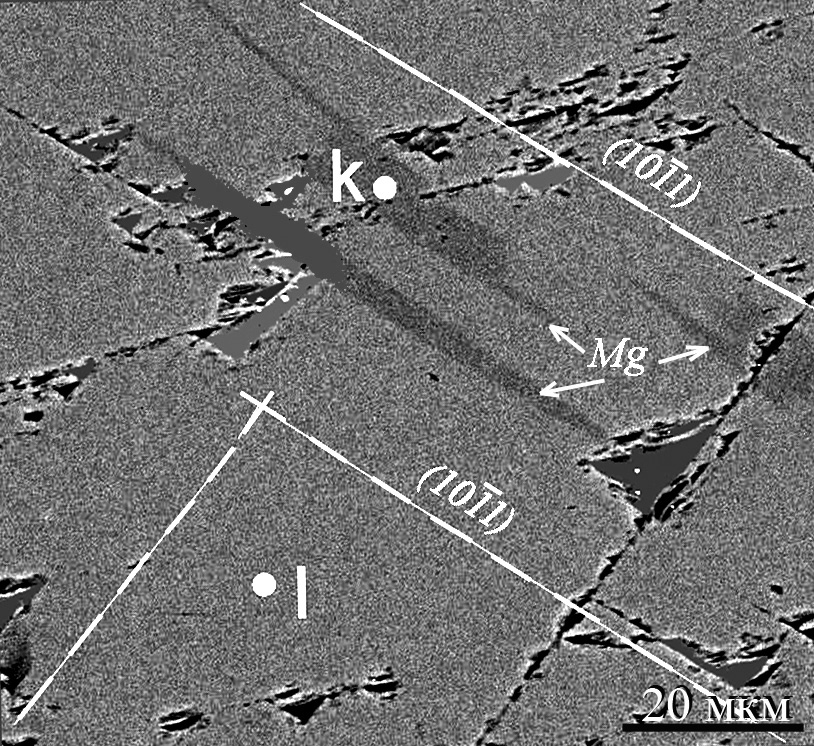 l (Mg0.86Fe0.13Mn0.01Ca0.005)CO3 – более светлая пирамида нарастания ромбоэдра.