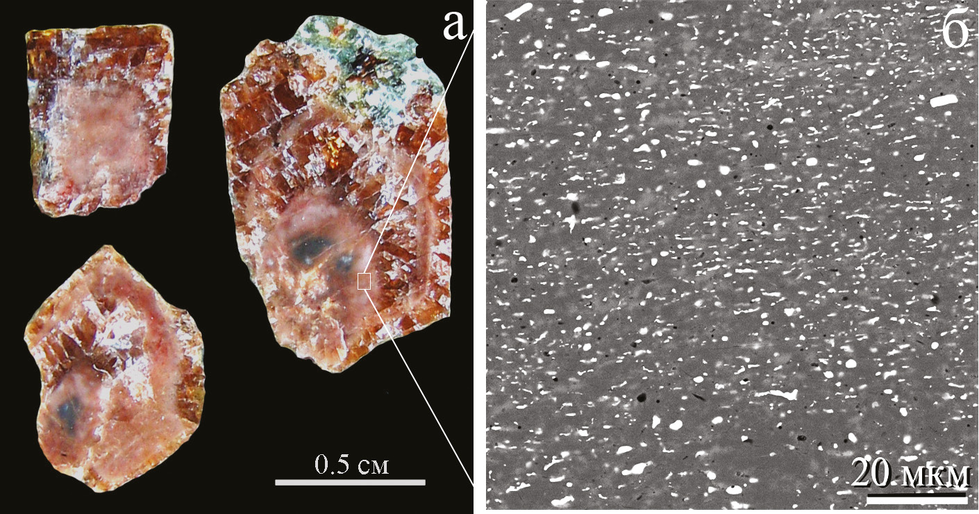 Fig. 11. Anatomy of zircon crystals from carbonatite-pegmatites of mine no. 97 of the Ilmeny State Reserve: a – oriented sections, polished surface; б – thorite inclusions in the inner zone of zircon growth.