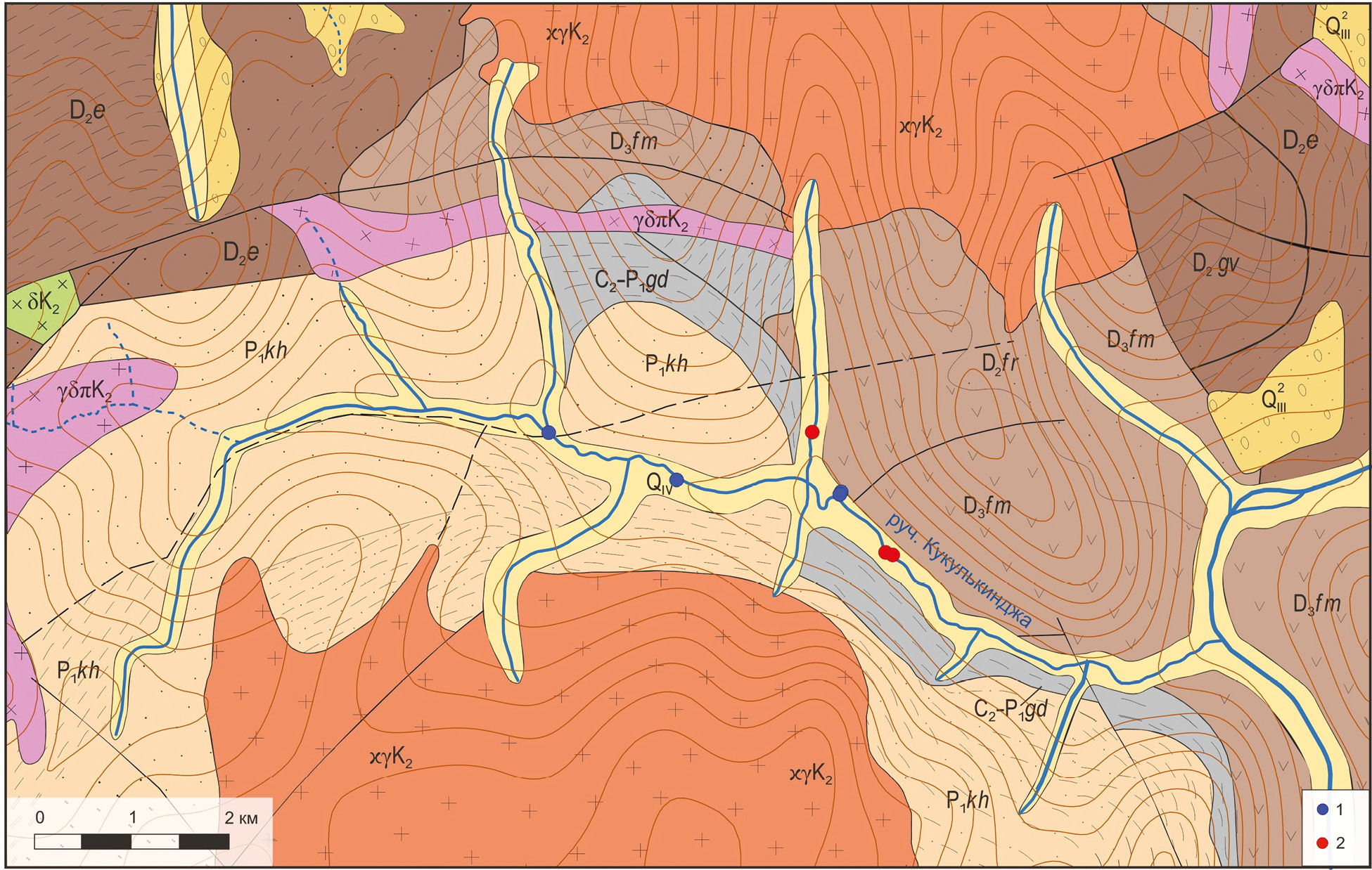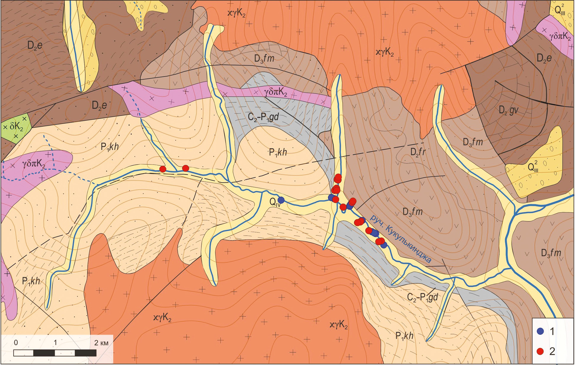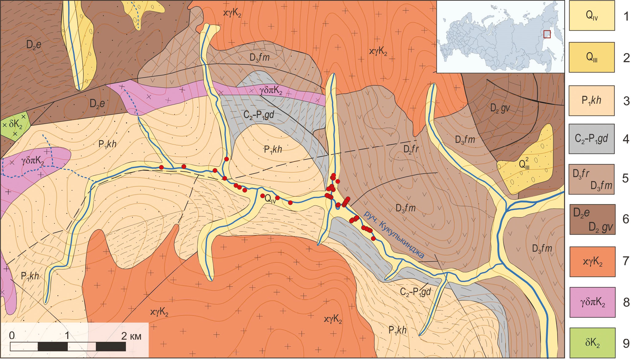 1 – Quaternary alluvial deposits: boulder, pebble, sand, loam; 2 – Upper Quaternary glacial and water-glacial deposits of the last glaciation epoch: boulder, pebble, and sand with gravel and clay; 3 – Lower Permian, Kukhtui Formation: gravelite, sandstone, siltstone, sandy-clay and carbonaceous-clay shale; 4 – Middle-Upper Carboniferous – Lower Permian, Gadekchan Formation: conglomerate, sandstone, siltstone, interlayers of carbonaceous-clay shale; 5 – Upper Devonian, Famennian: rhyolite, andesite, their tuff, tuff conglomerate, tuff gravelite, tuff sandstone, tuff siltstone, and clay shale with limestone interlayers; 6 – Upper Devonian, Fransian: conglomerate, sandstone, siltstone, and clay shale with limestone interlayers; 7, 8 – Late Cretaceous intrusions: 7 – subalkali granite; 8 – granodiorite porphyry; 9 – volcanic and volcanosedimentary complex: diorite, quartz diorite. Sampling points for heavy concentrates are marked by red circles.