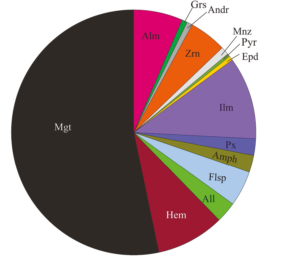 Минеральный состав шлиховых проб. Преобладающими минералами в шлиховых пробах являются магнетит, ильменит и гематит, на долю которых приходится свыше 2/3 шлиха: магнетит – 53.3 %, ильменит – 9.5 %, гематит – 9.1 % (рис. 2). В порядке убывания шлиховые пробы также содержат минералы группы граната, циркон, алланит, пироксены и амфиболы, монацит, эпидот, пирит, периодически присутствуют титанит, рутил, пиролюзит, редко – шеелит. Из минералов легкой фракции встречены кварц и плагиоклаз. В некоторых шлихах установлены зерна киновари, в единичных случаях – халькопирит, галенит и малахит.