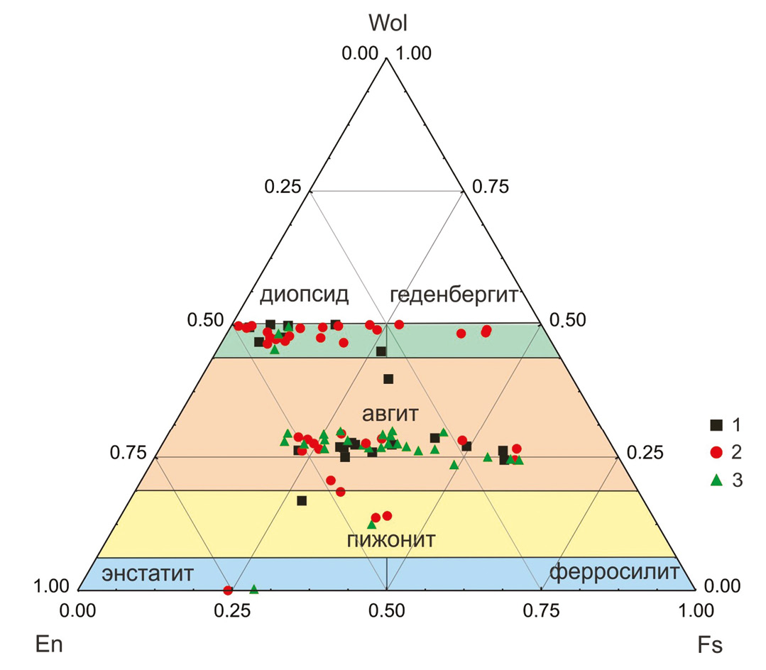 Fig. 3. Classification diagram of Ca-Fe-Mg pyroxenes (based on the nomenclature (Ca,Mg,Fe2+)Si2O6 system (Winchell, 1953) with additions of I.V. Ginzburg).