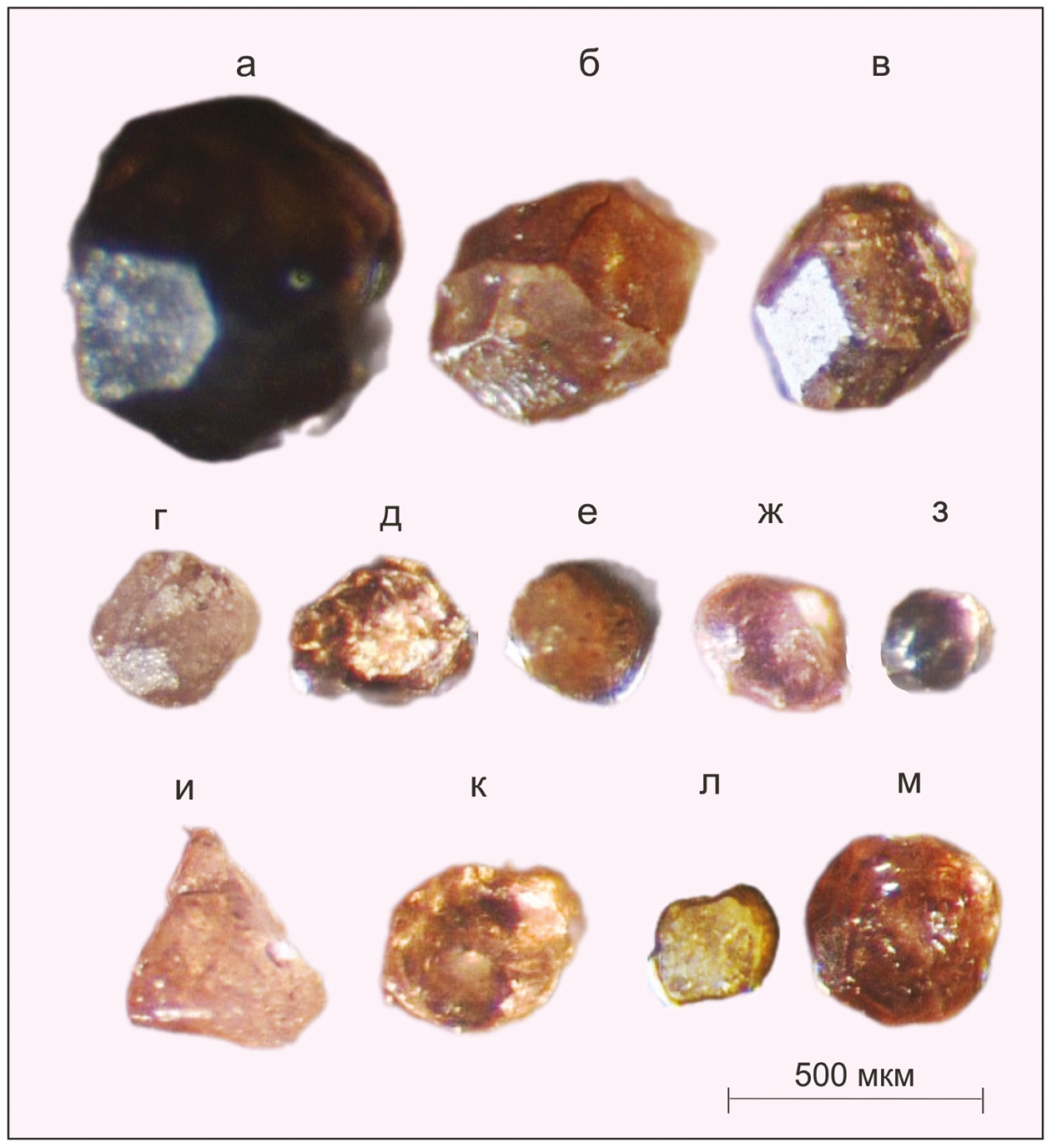 Рис. 4. Морфология изученных гранатов: а–в – гранаты с кристаллографическими очертаниями; г–м – слабо откатанные зерна гранатов.